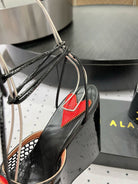 ALAIA BANQUET WEDGE SANDALS IN BLACK LAMBSKIN WITH RED HEART