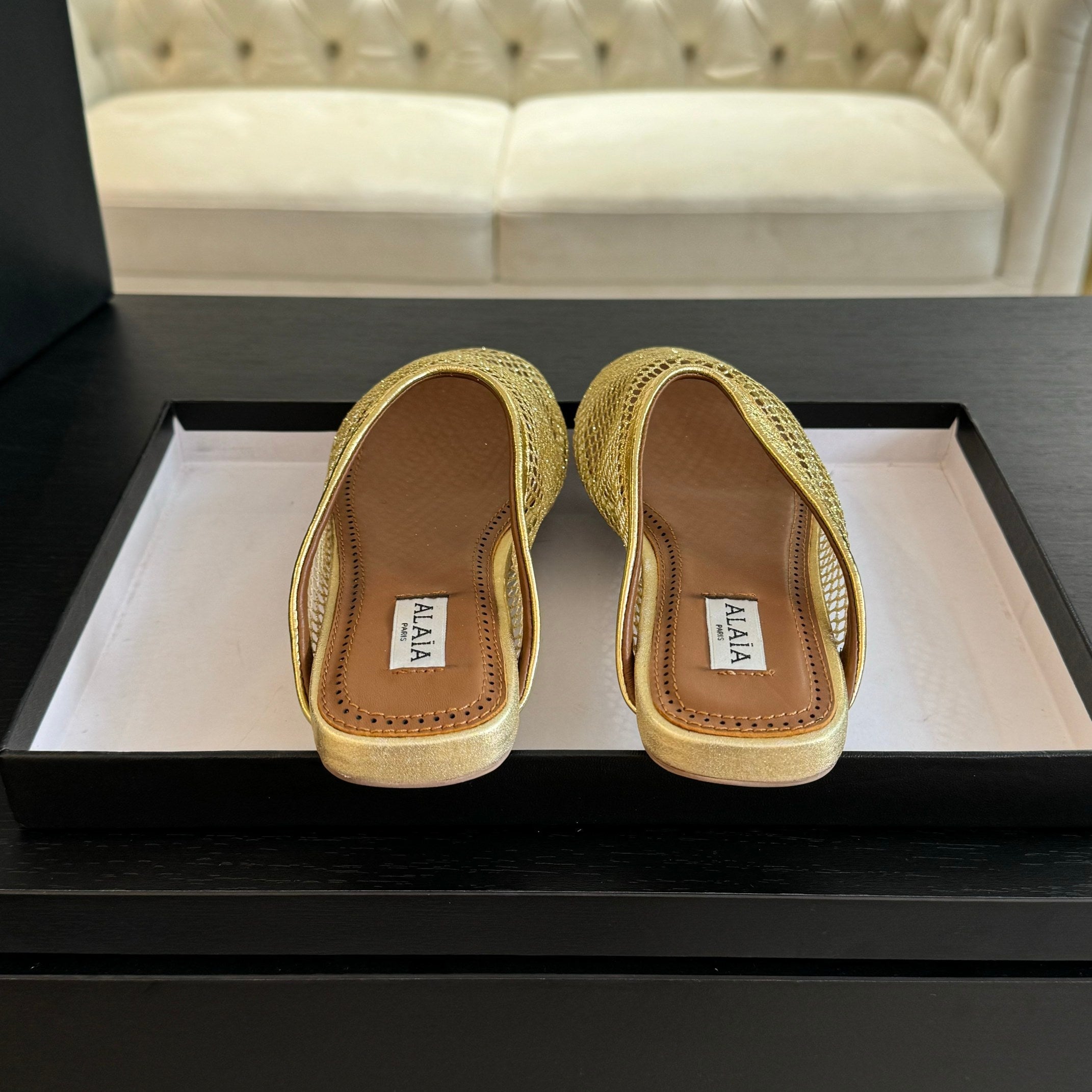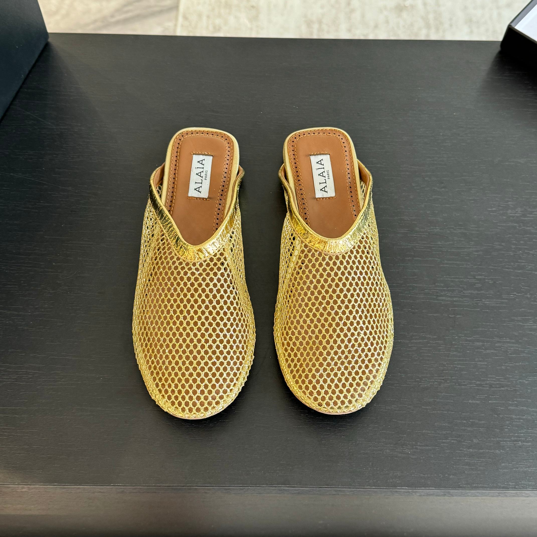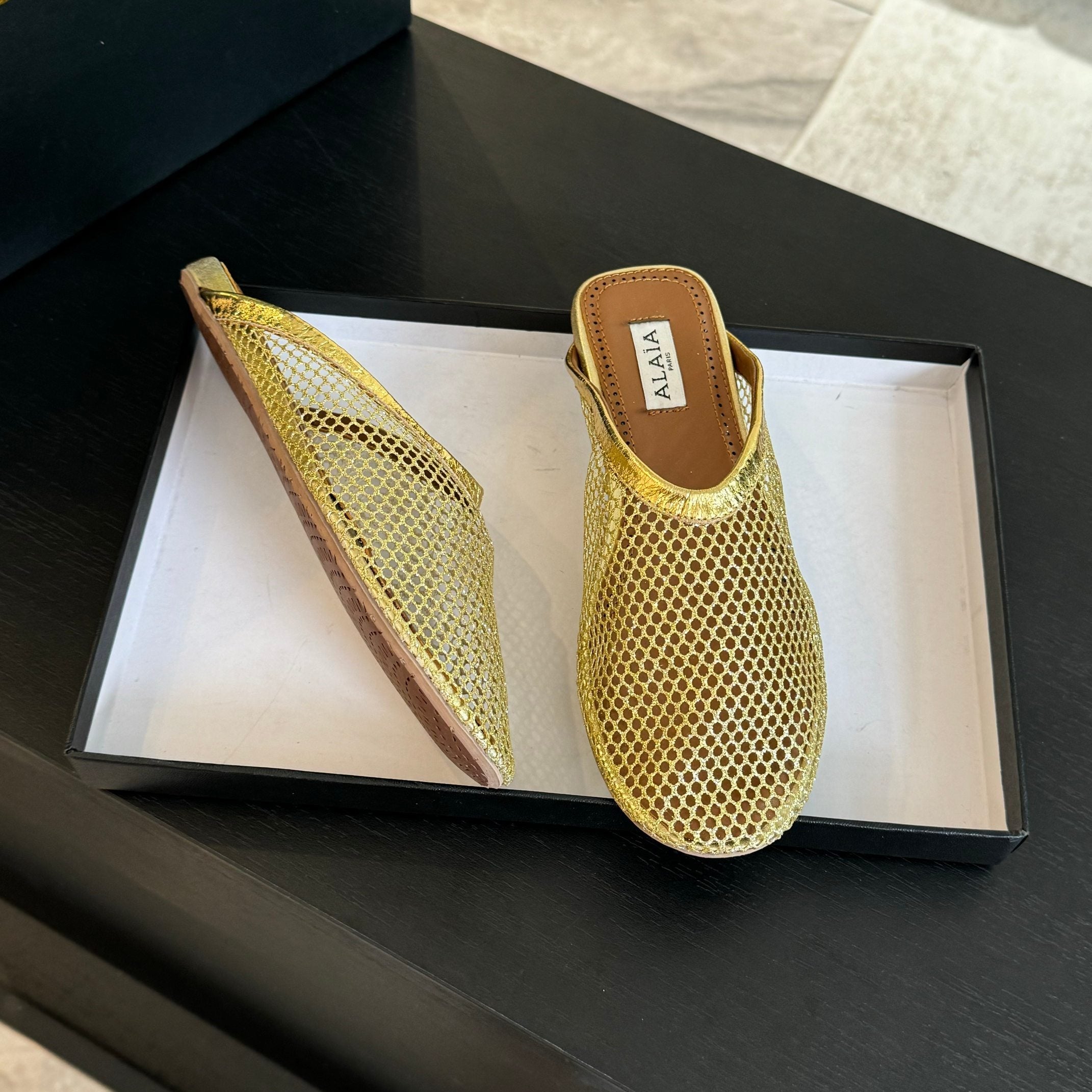ALAIA FLAT MULES IN SILVER MESH FISHNET