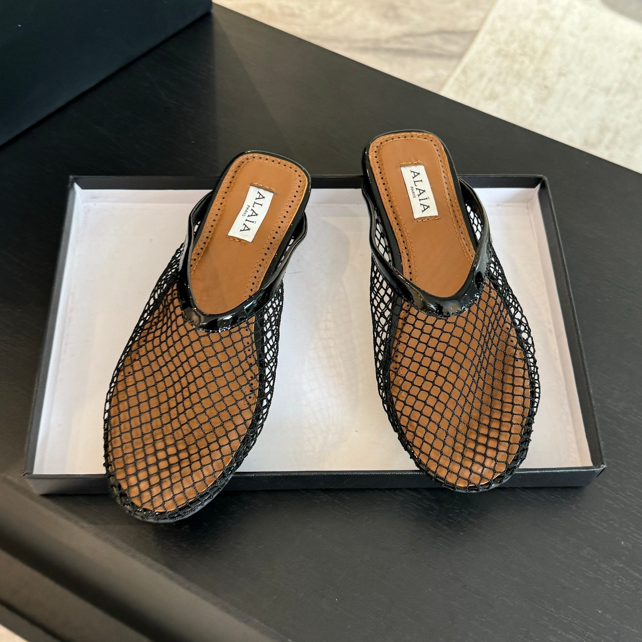 ALAIA FLAT MULES IN CERULEAN BLUE MESH FISHNET