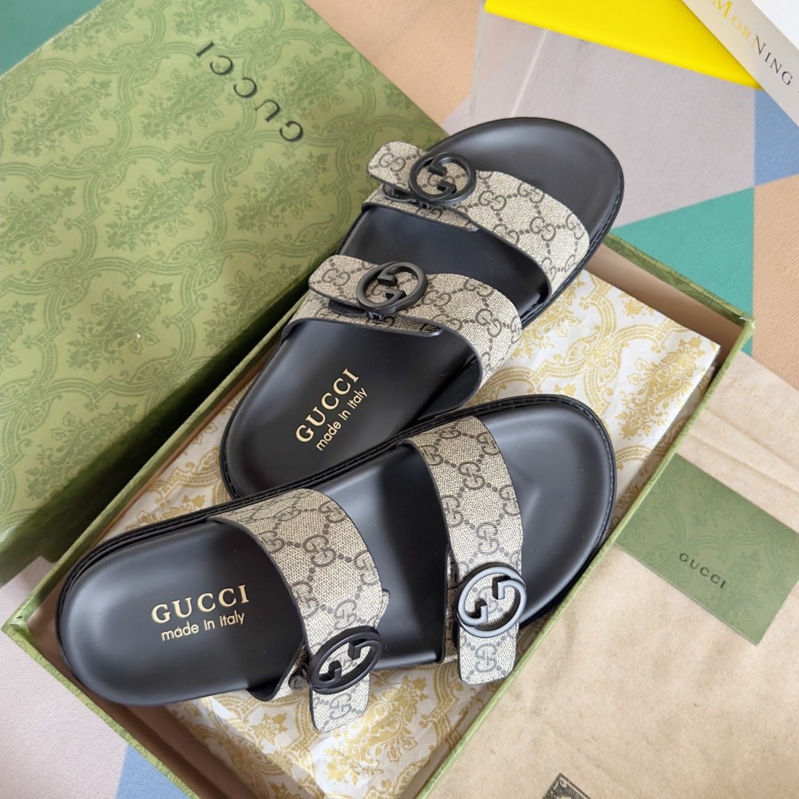 GG Men's Sandals Slide Green Black Leather