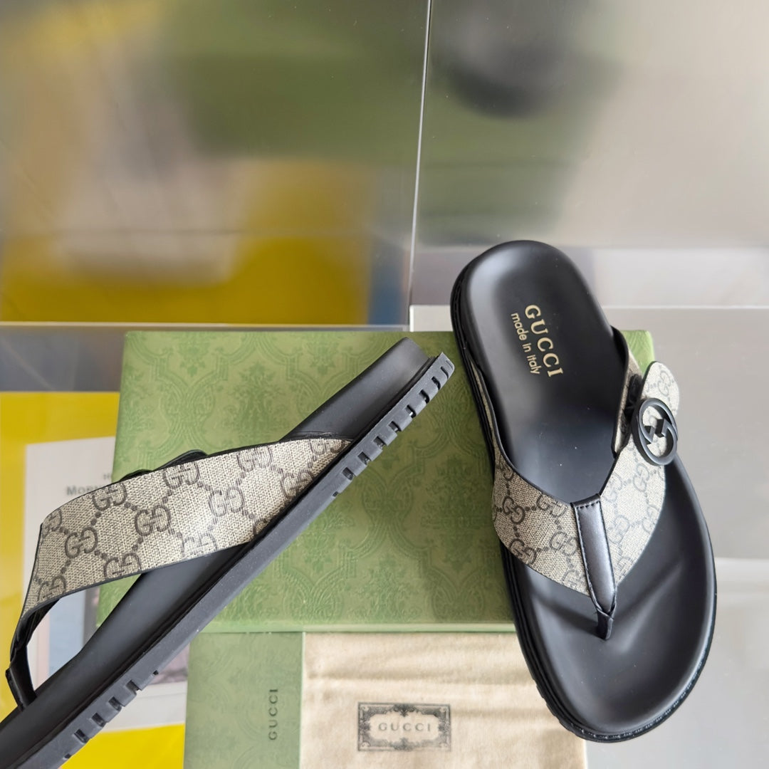 GG Men's Thong Sandals Black Brown Canvas Cowhide 542952