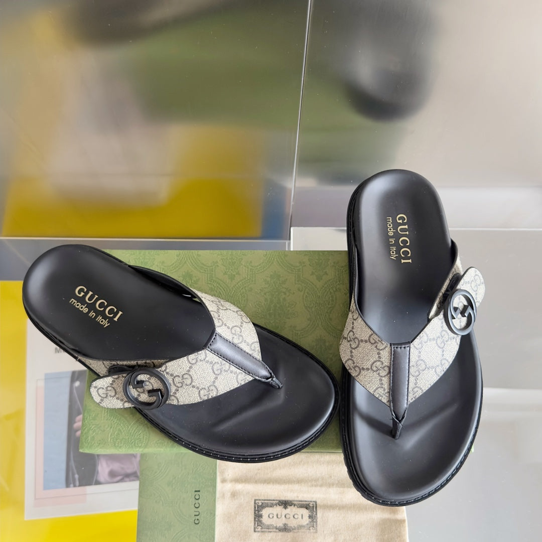 GG Men's Thong Sandals Black Canvas Cowhide 542951