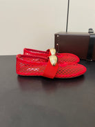 ALAIA BALLET FLATS IN CHERRY RED MESH FISHNET WITH GOLD HARDWARE