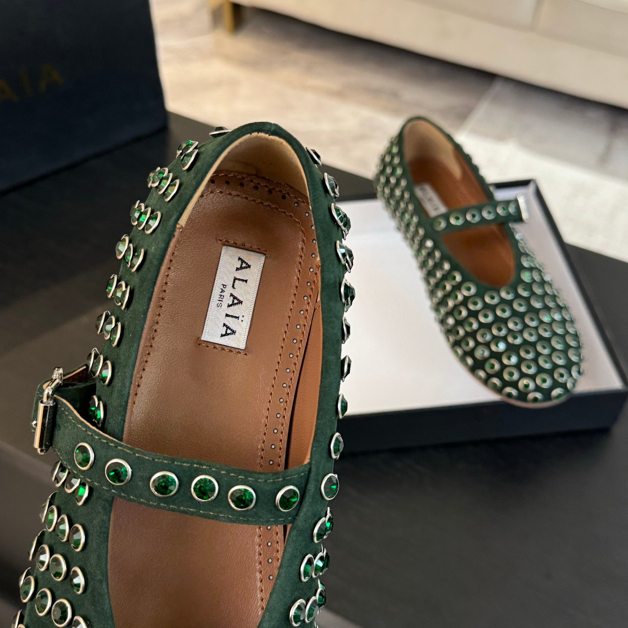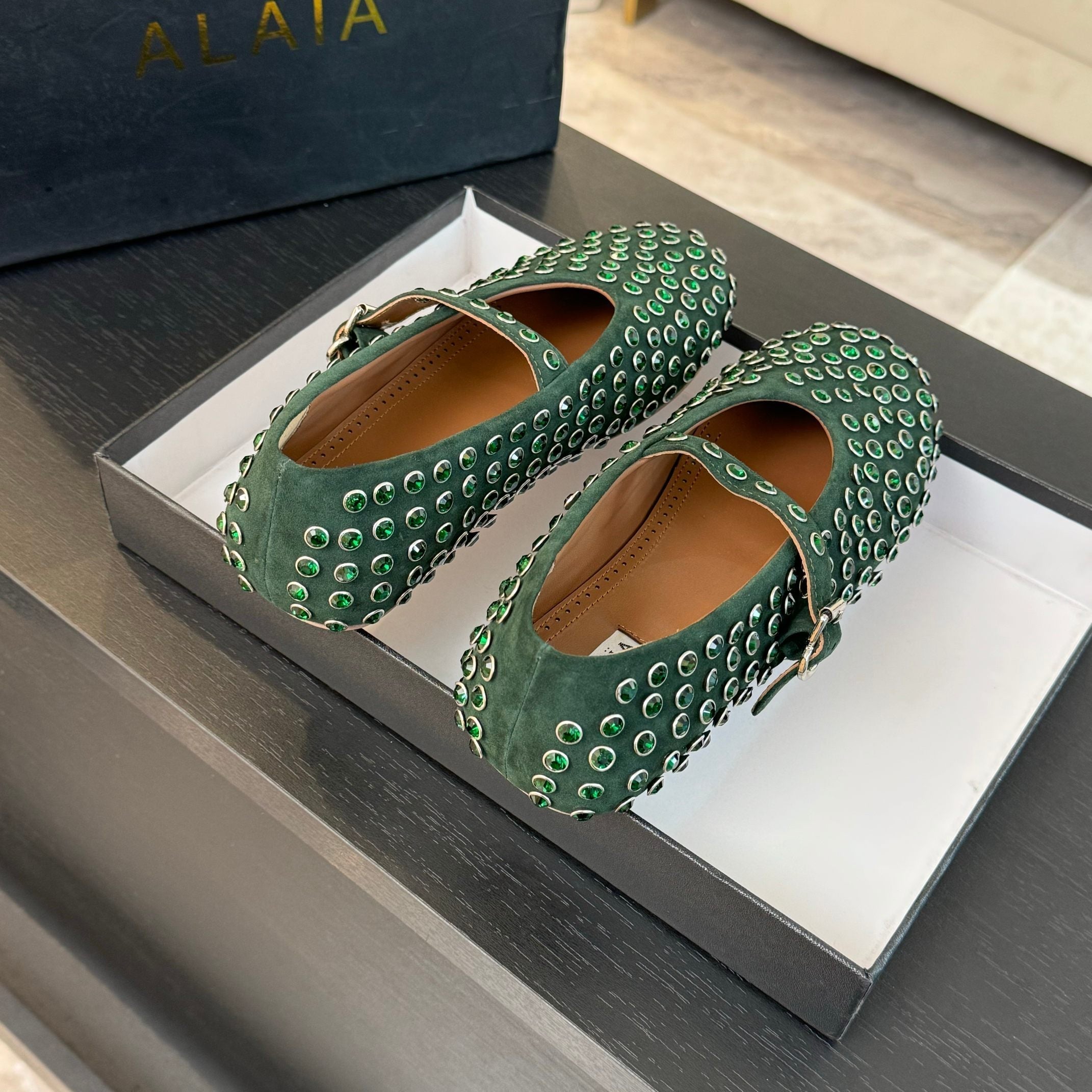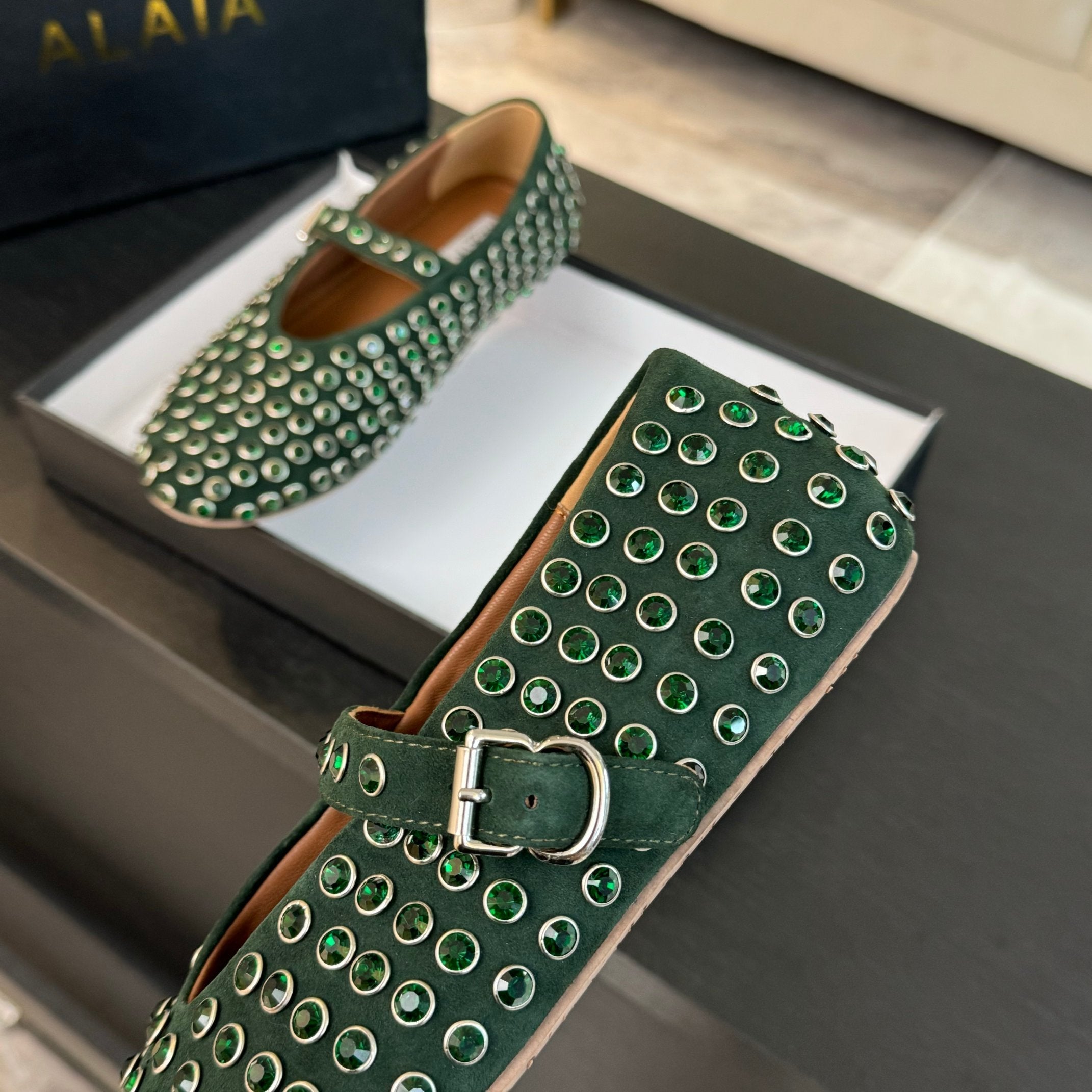 Alaia Strass Ballet Flats In Dark Green Suede Stone 935187