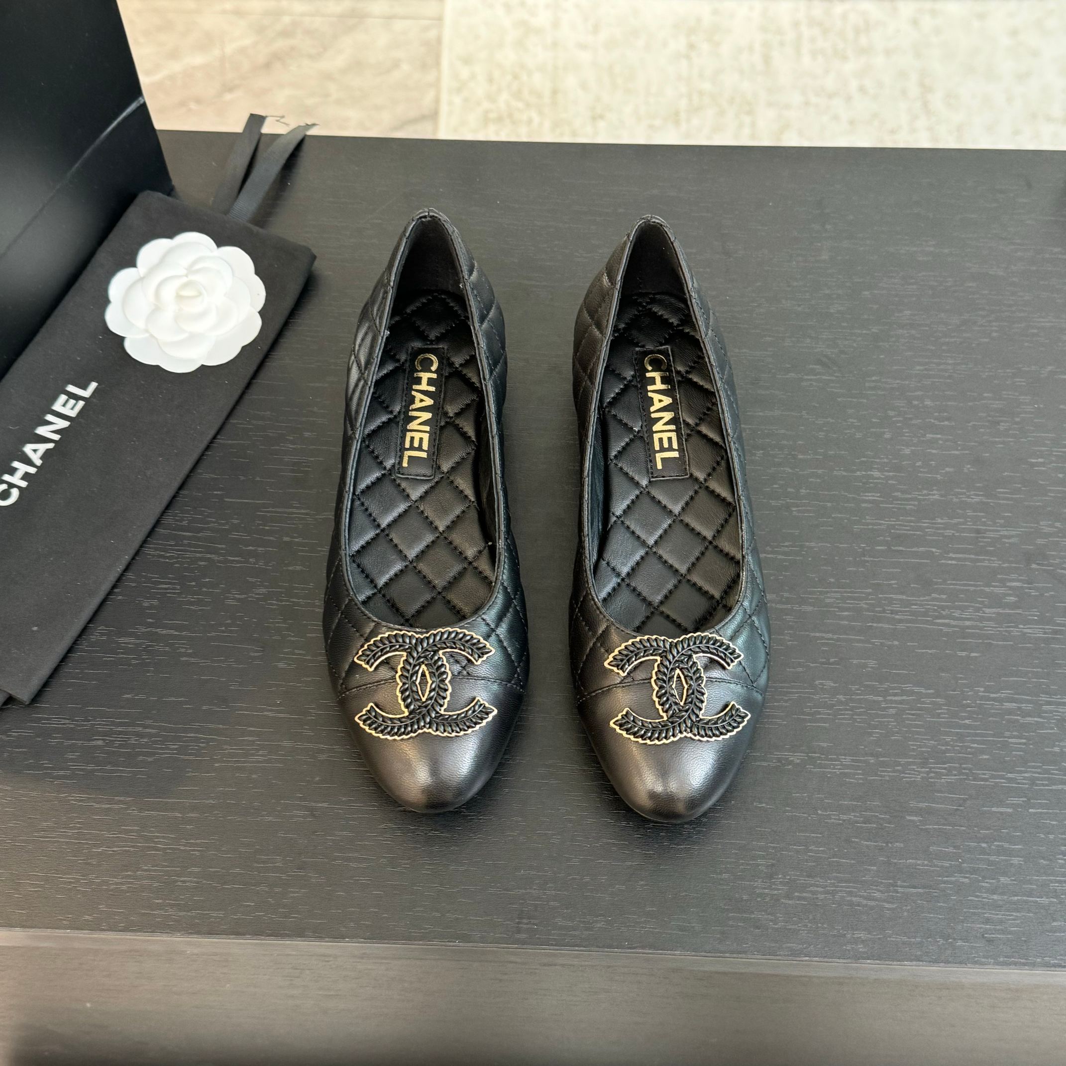 ballet flat black quilted lambskin large black cc logo