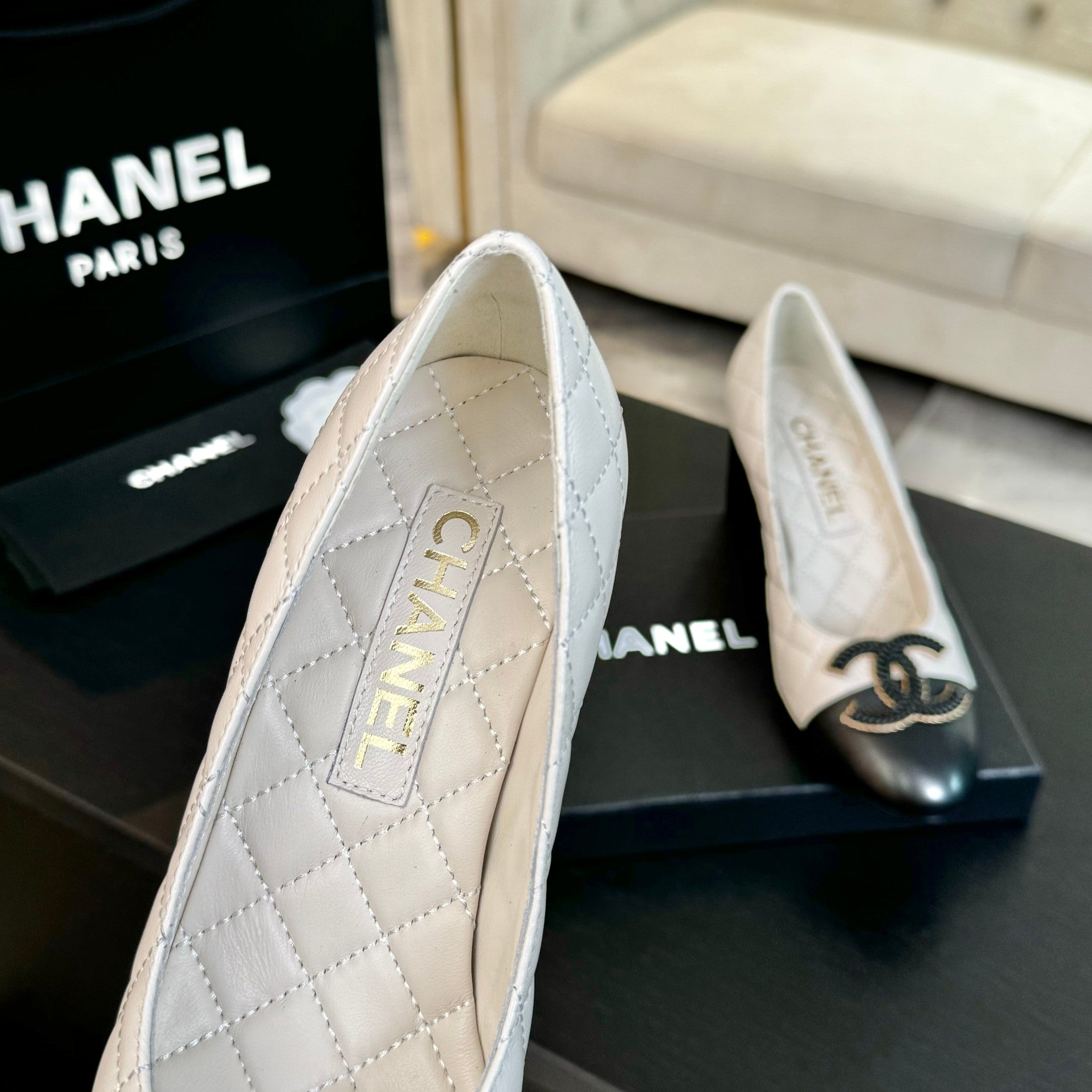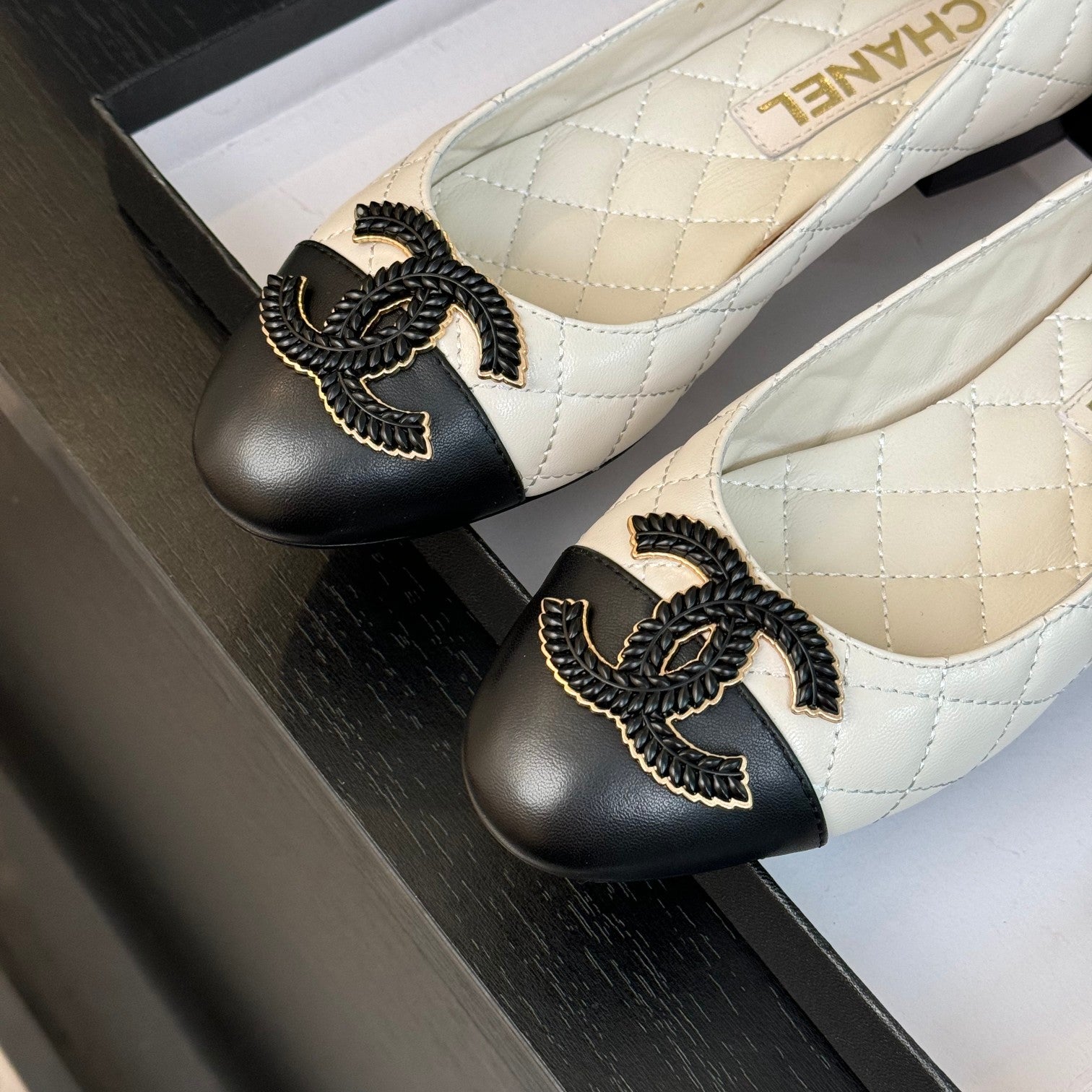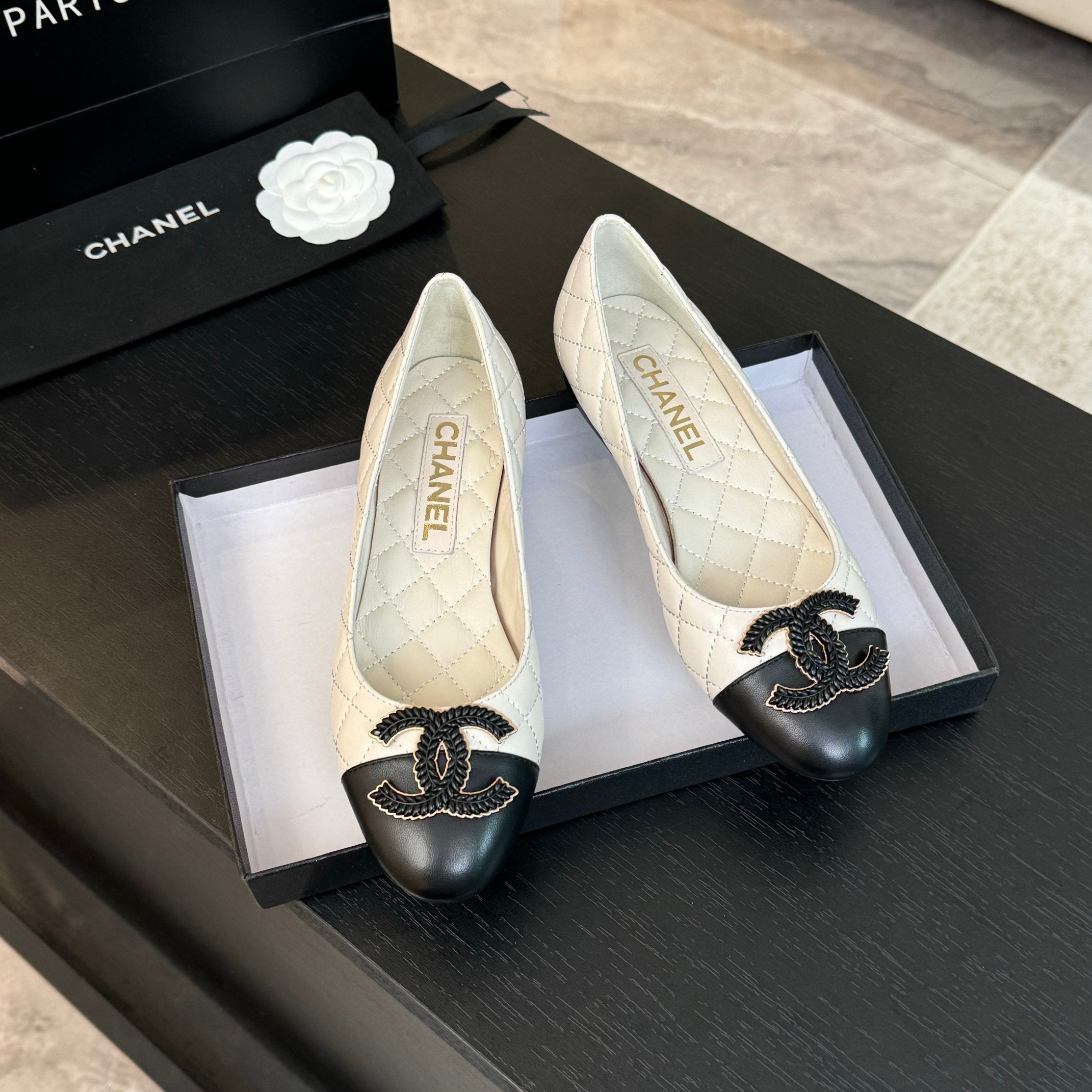 ballet flat beige quilted lambskin large black cc logo
