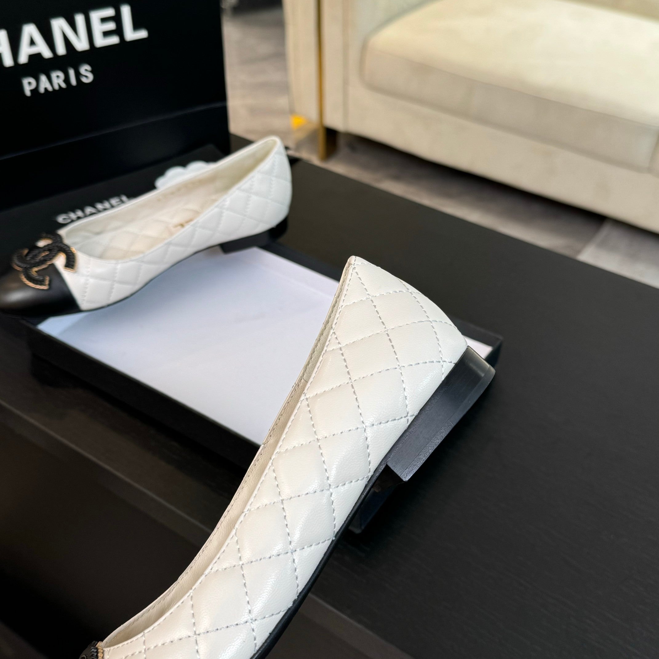 ballet flat white quilted lambskin large black cc logo