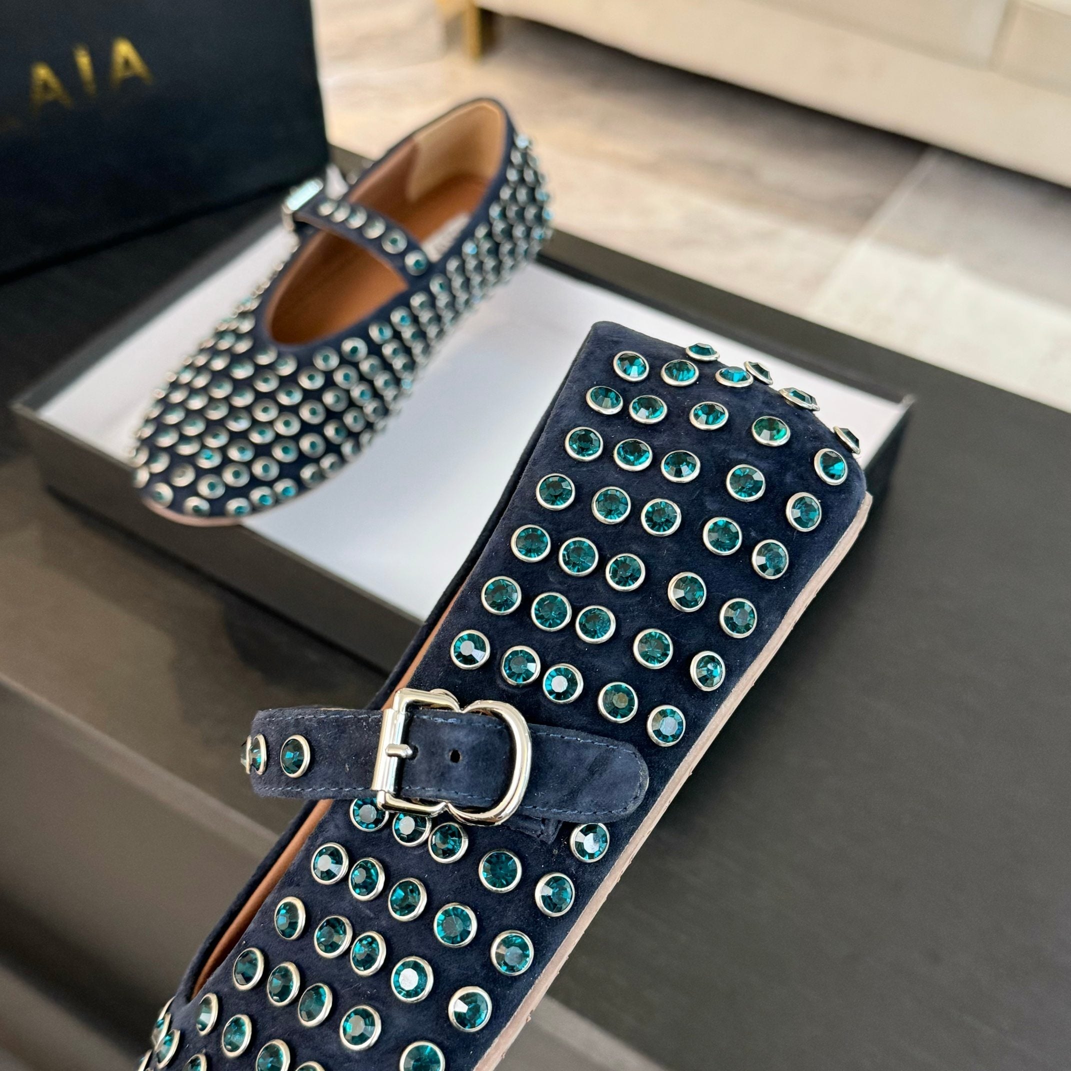 Alaia Strass Ballet Flats In Deep Blue Suede Stone 935185