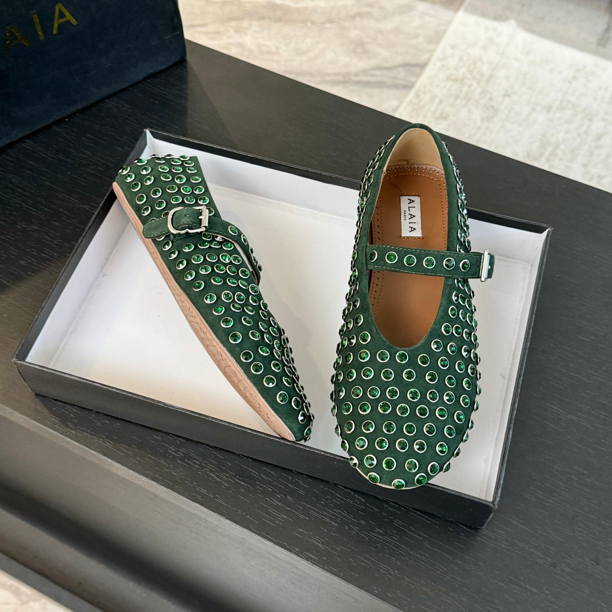 Alaia Strass Ballet Flats In Dark Green Suede Stone 935187