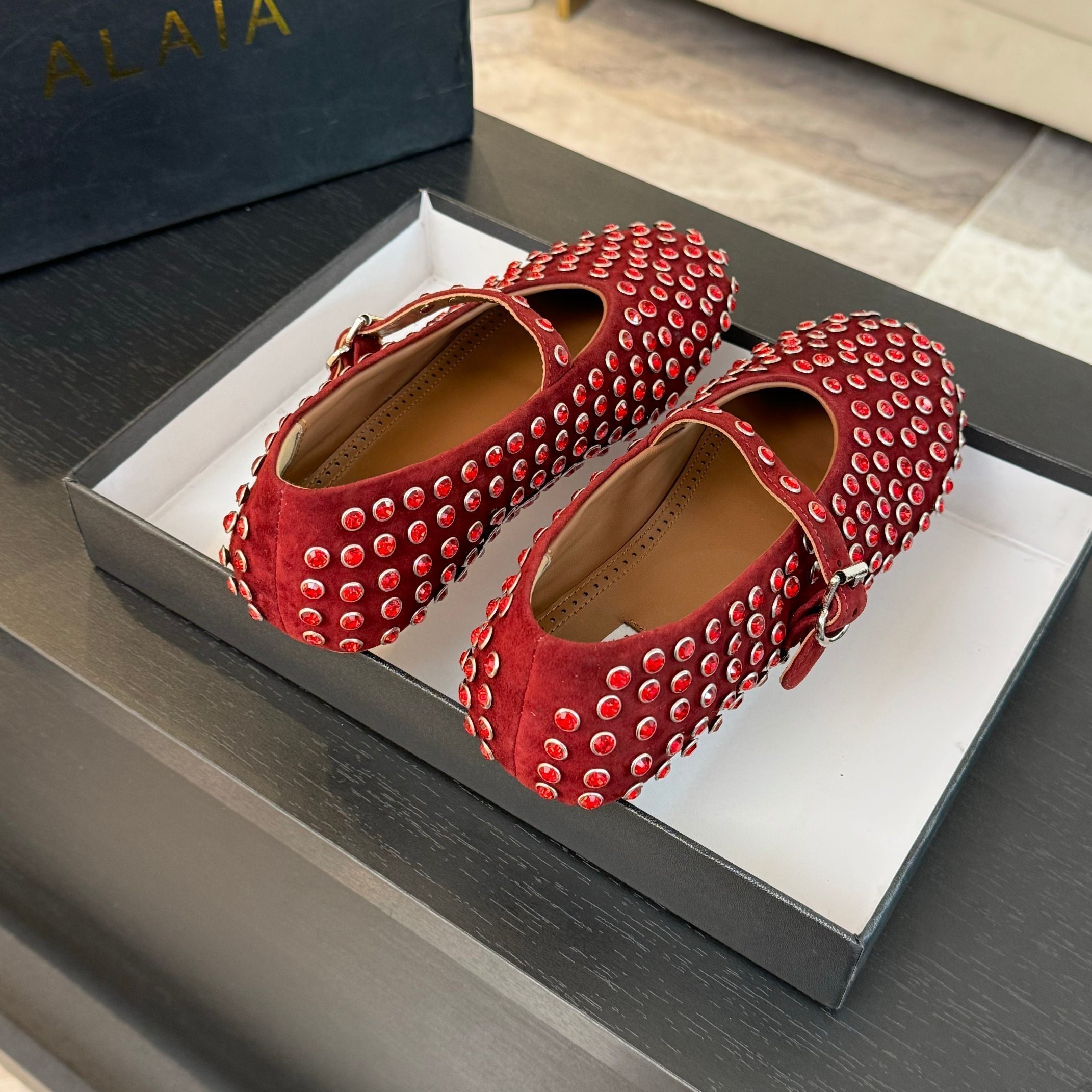 Alaia 25 Strass Ballet Flats Garnet Red Suede Goatskin 303725
