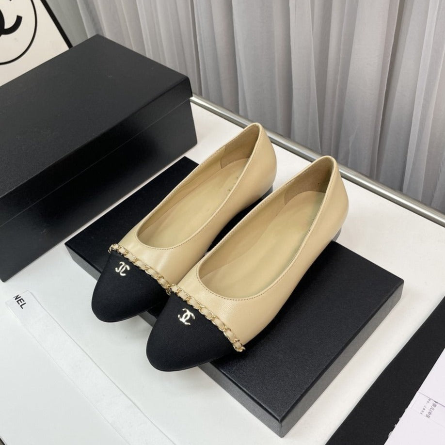 ballet flat beige lambskin black leather chain grosgrain