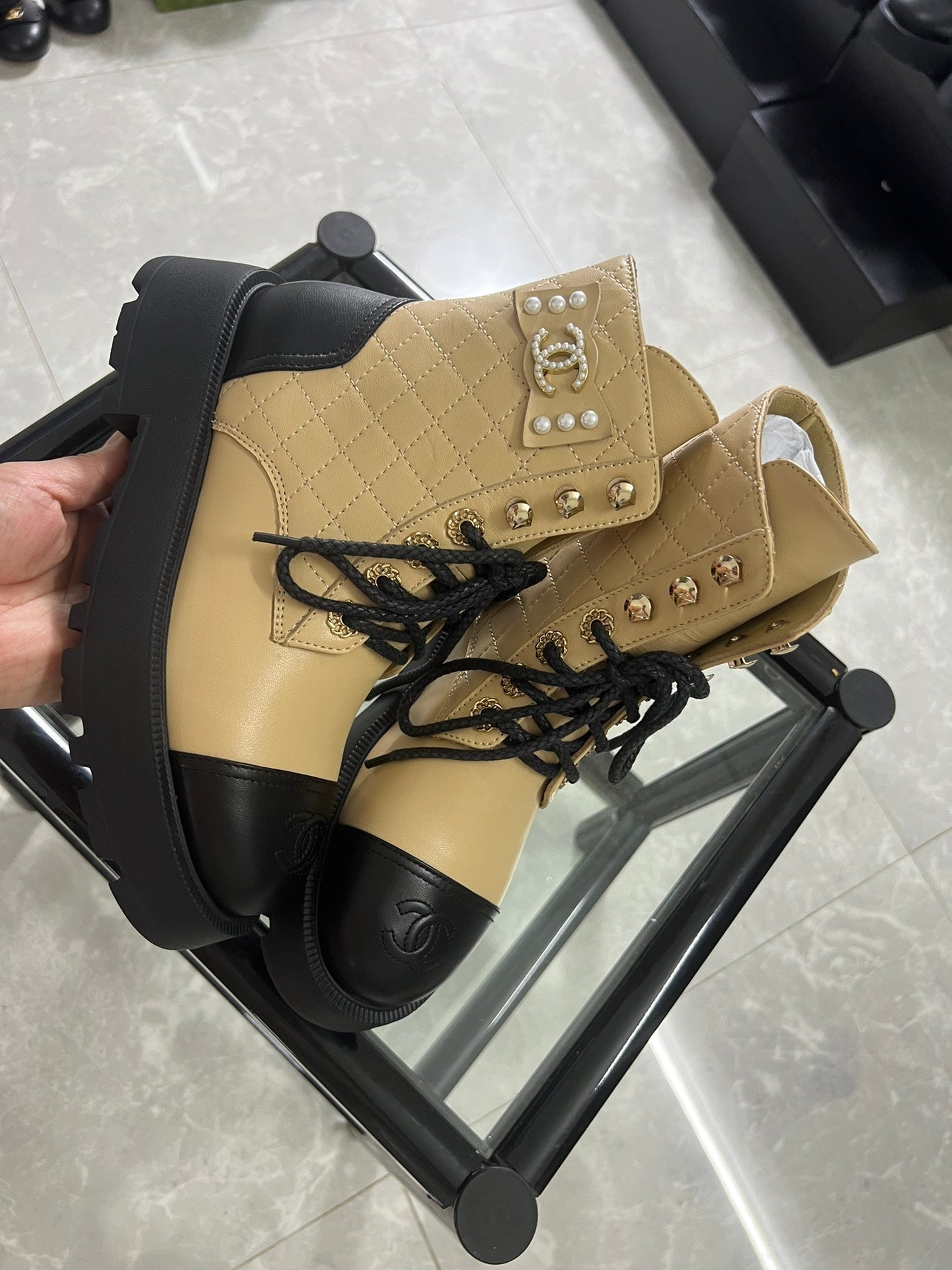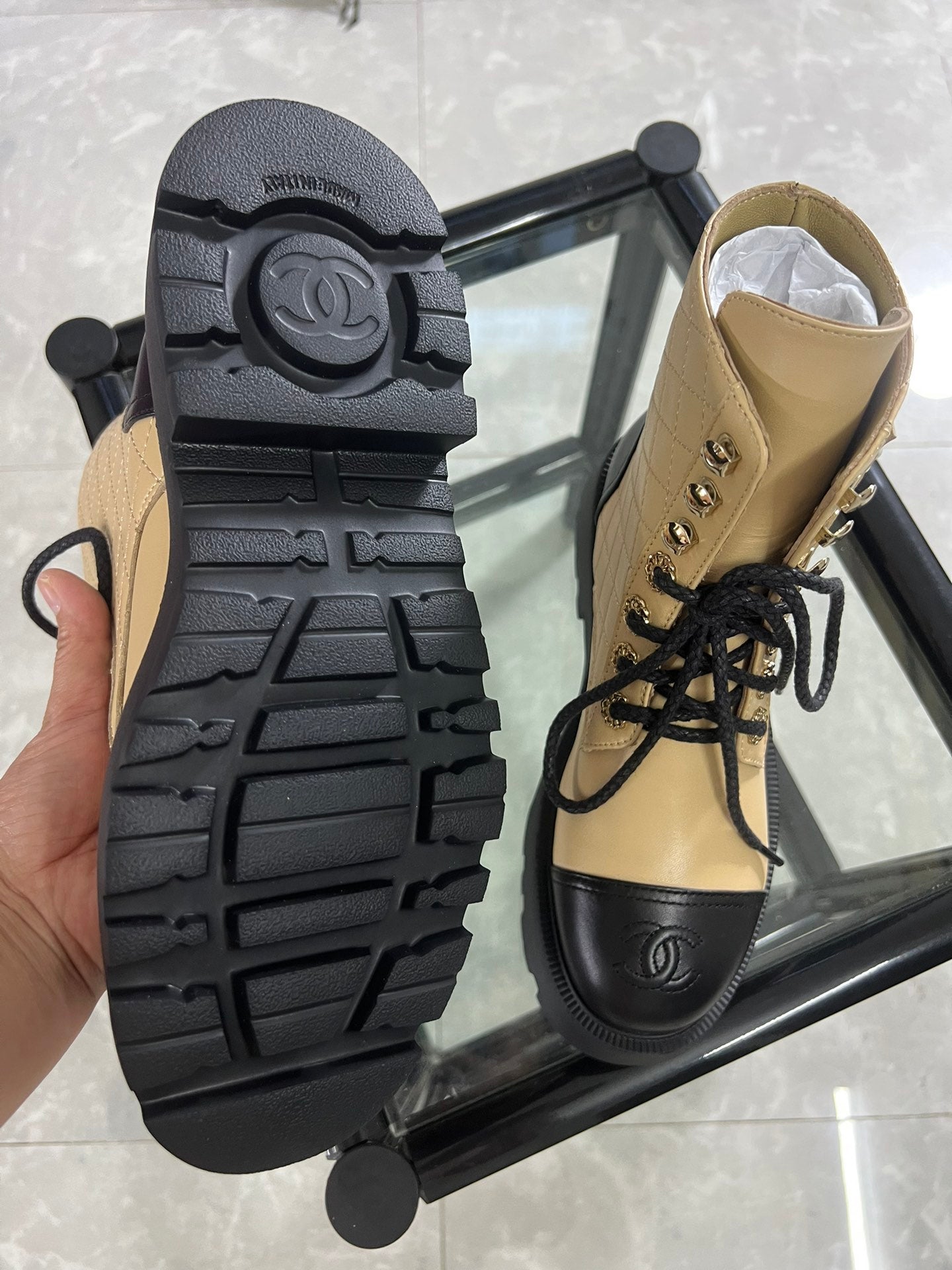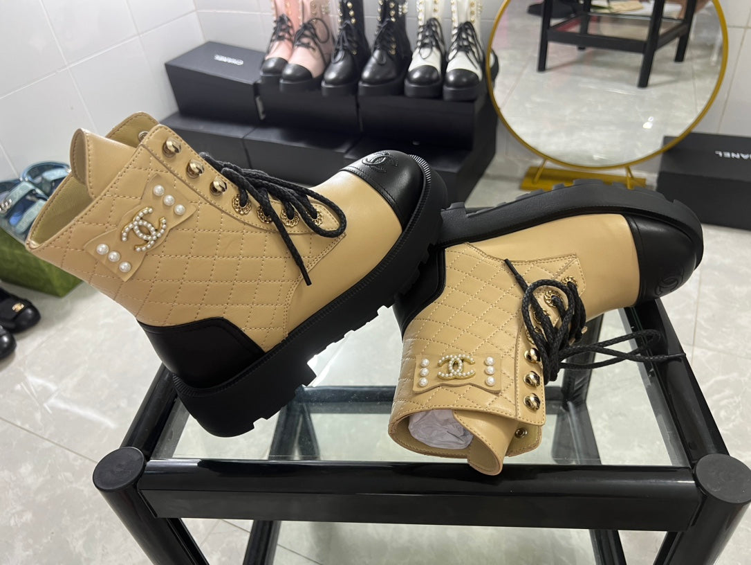 CC Combat Boots Dark Beige Black Quilted Lambskin 944575