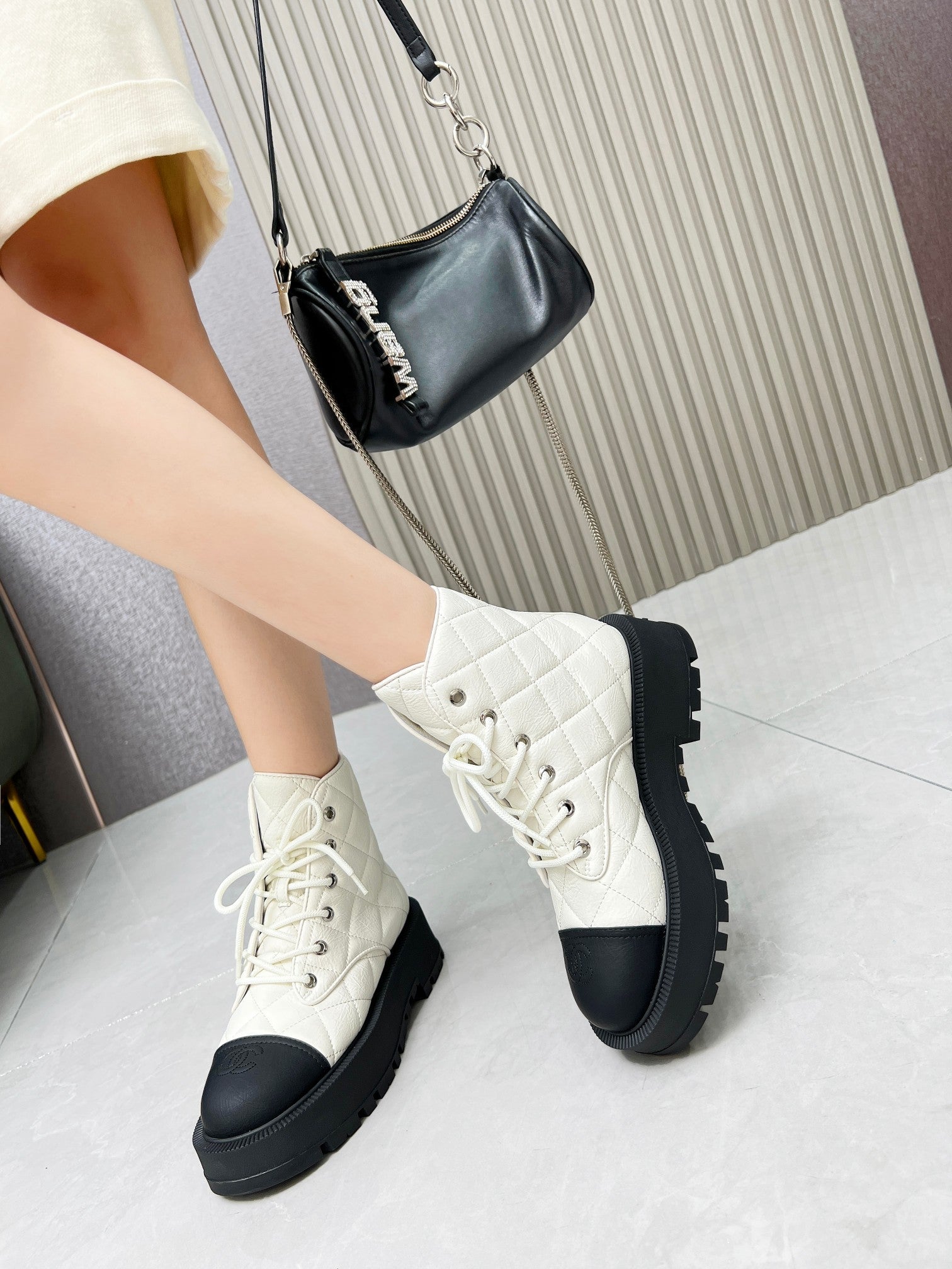 CC Combat Boots In White Mix Black Quilted Lambskin 944577