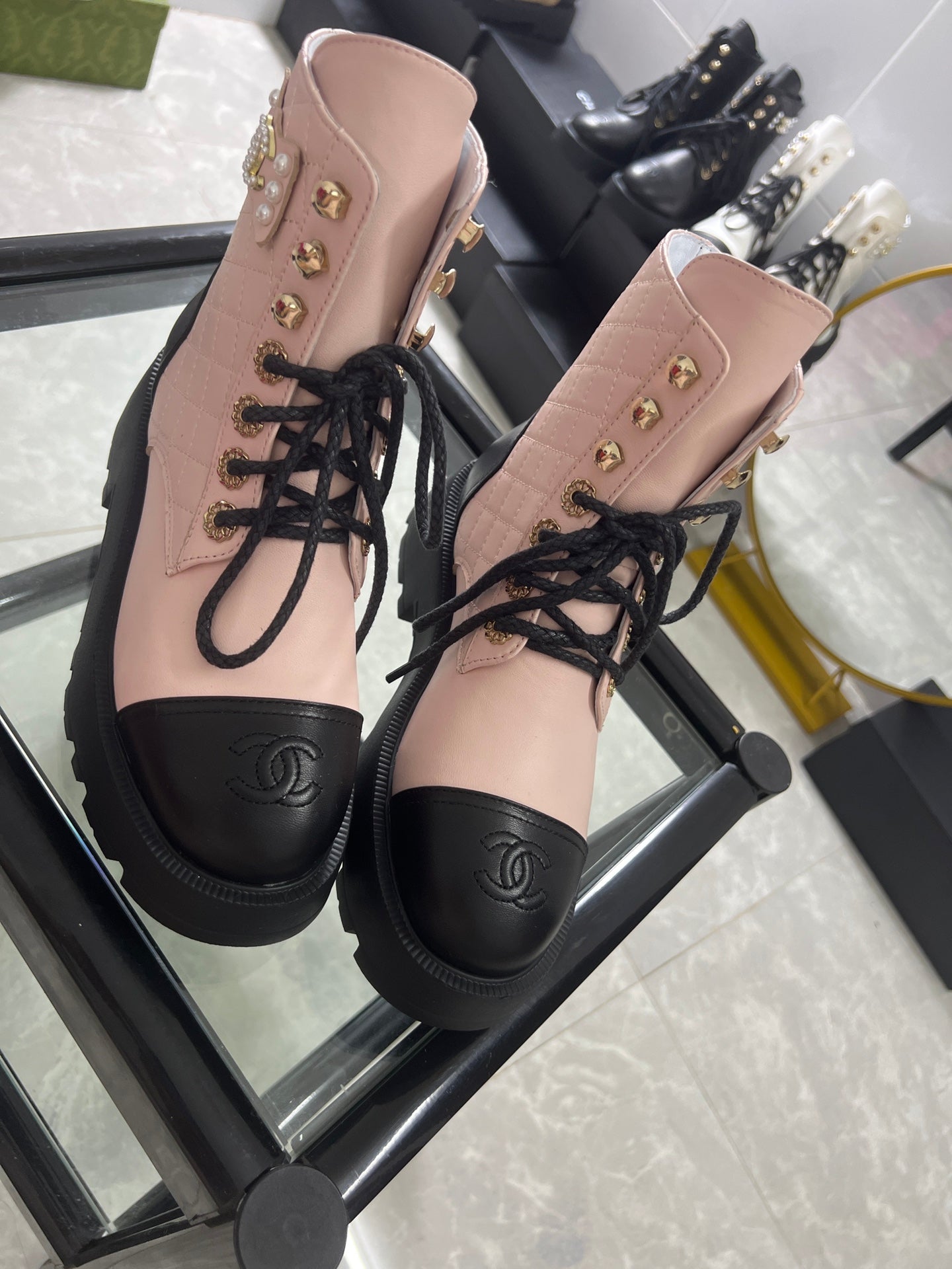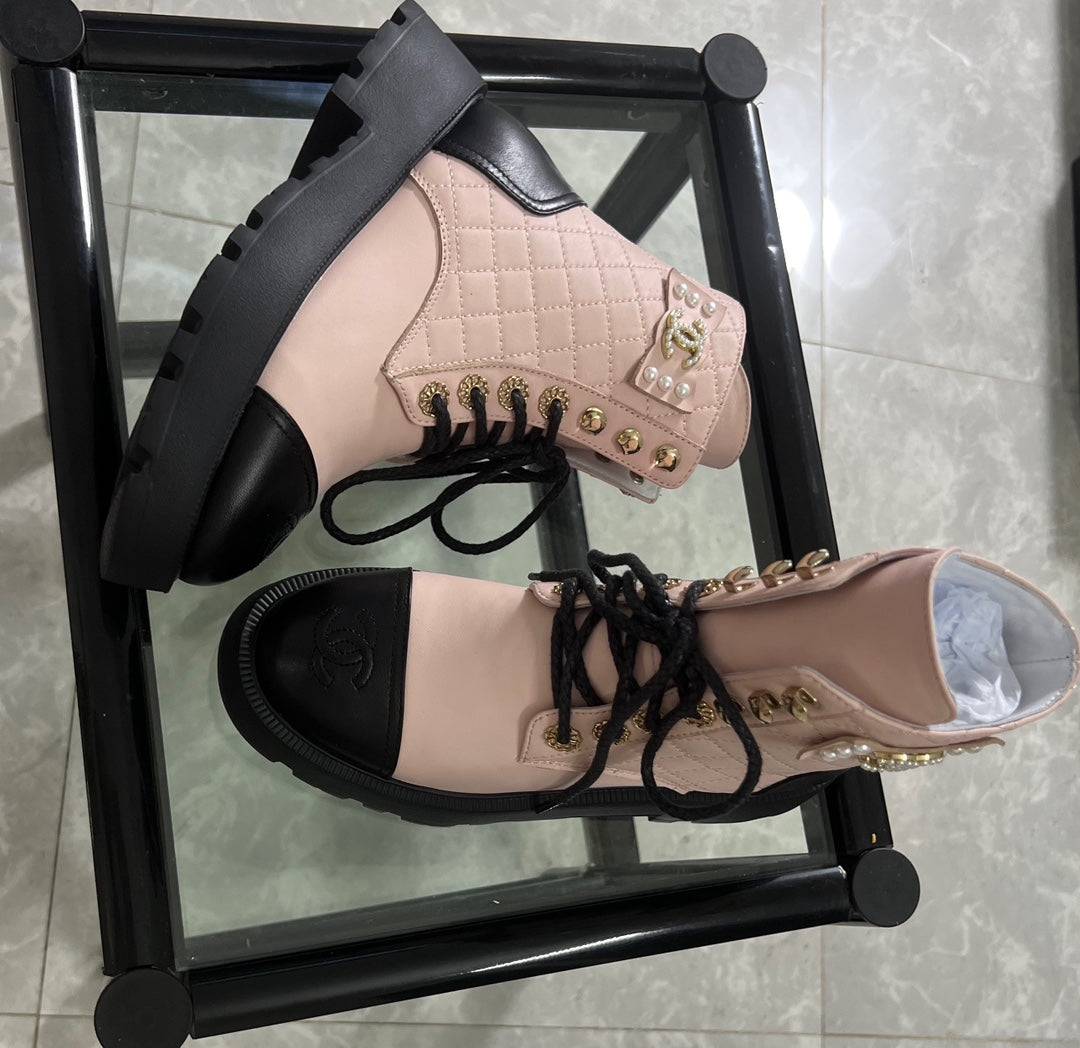 CC Combat Boots Pastel Pink Black Quilted Lambskin 944573
