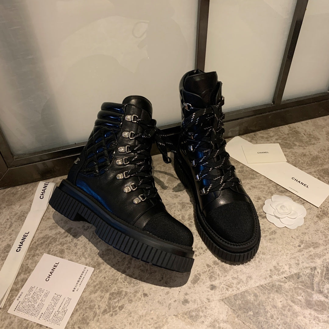 CC Combat Boots 50mm In Black Glossy Calfskin Quilted And Lycra Fabric 940073