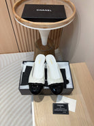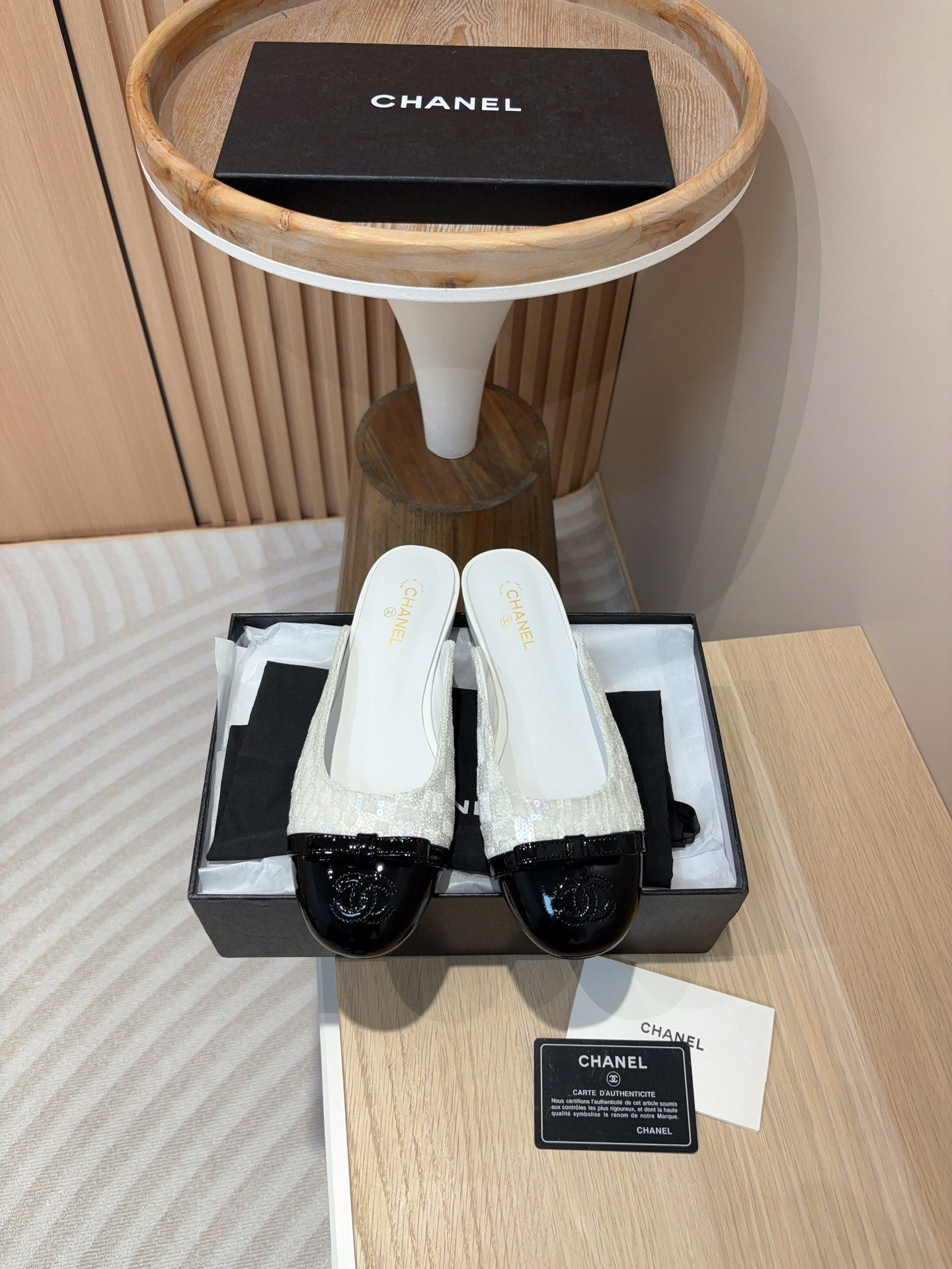 cc mule white tweed sequin black patent calfskin