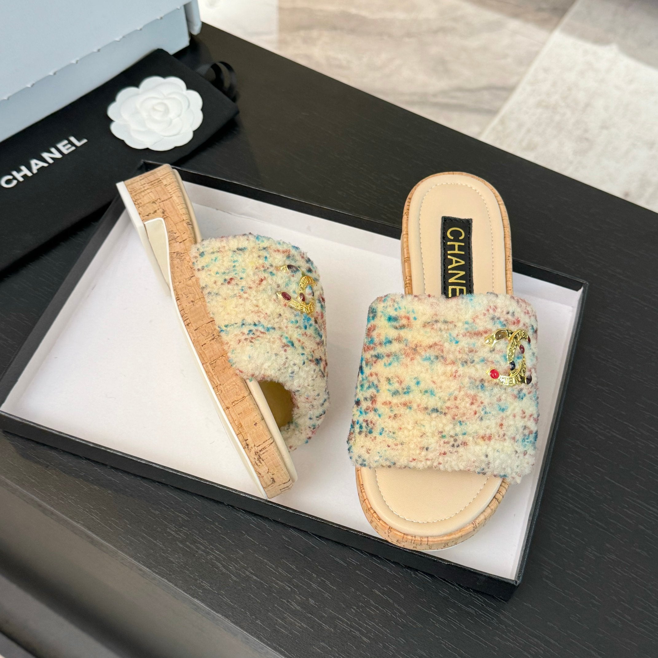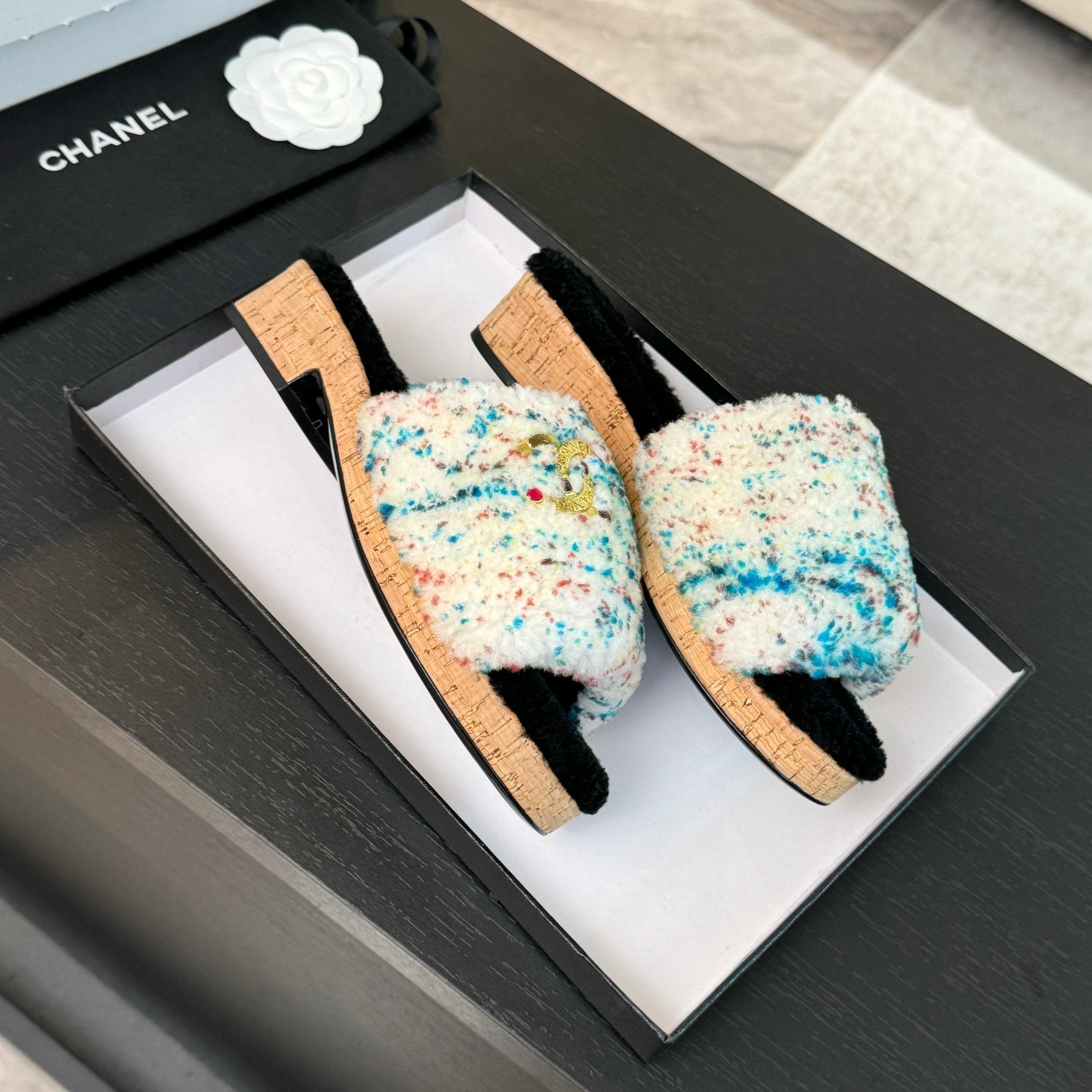 CC Slippers White Black And Blue Red Wool And Calfskin