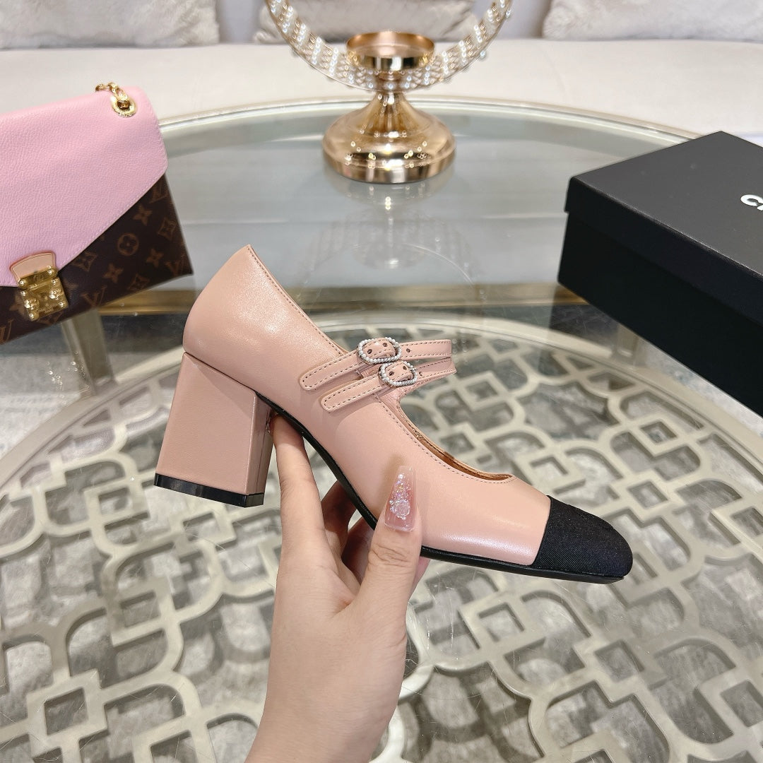 mary janes 60 double buckle light pink calfskin black grosgrain