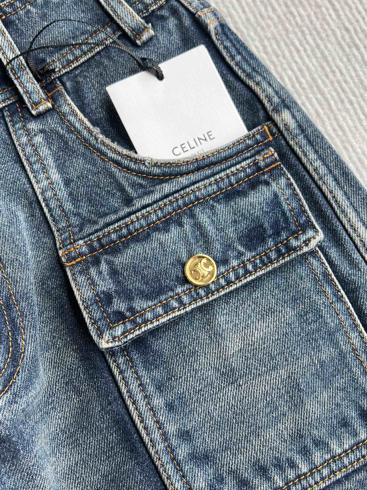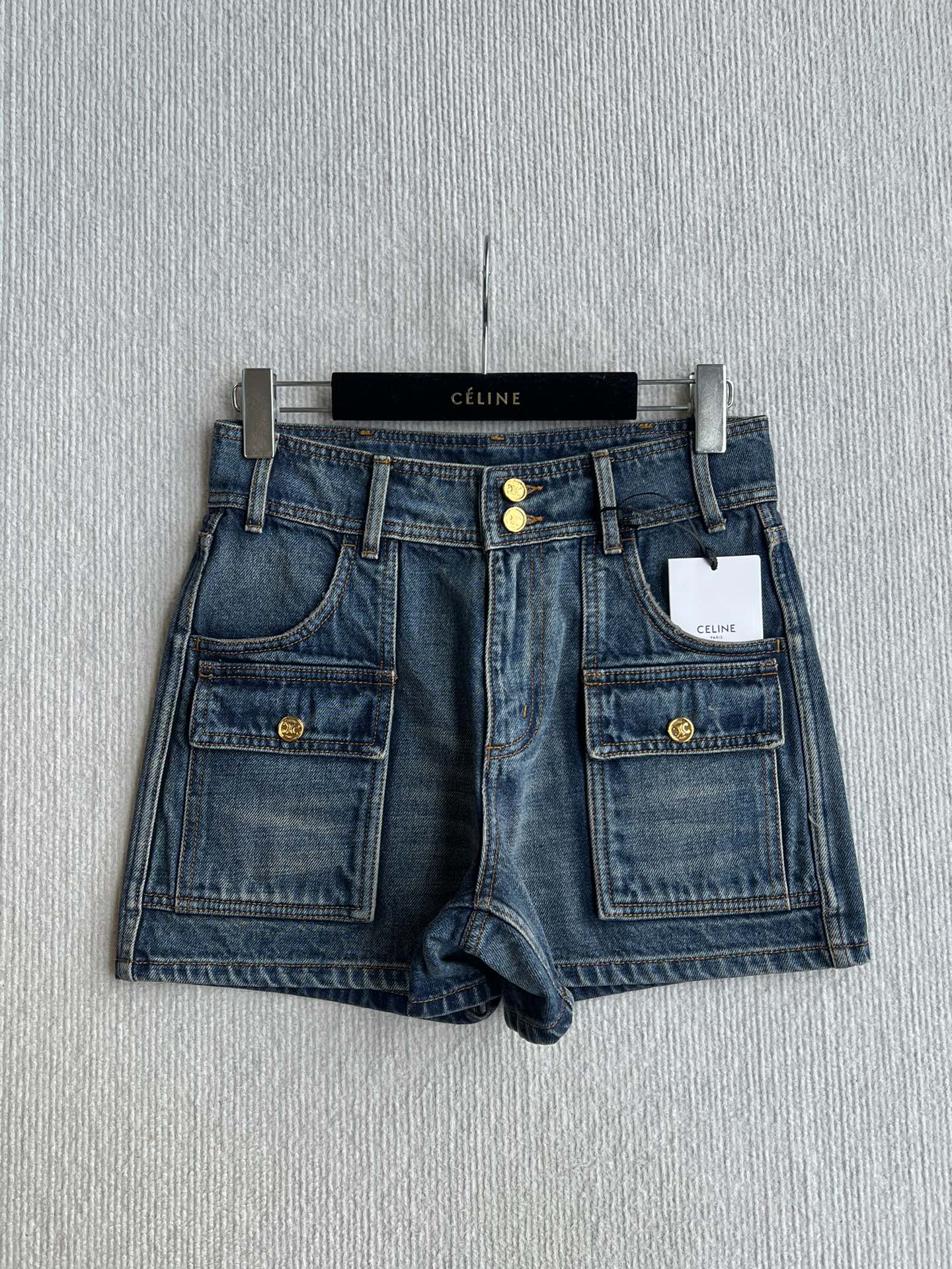Celine 25 Arc de Triomphe Metal Buckle Denim Shorts Blue Cotton 275804
