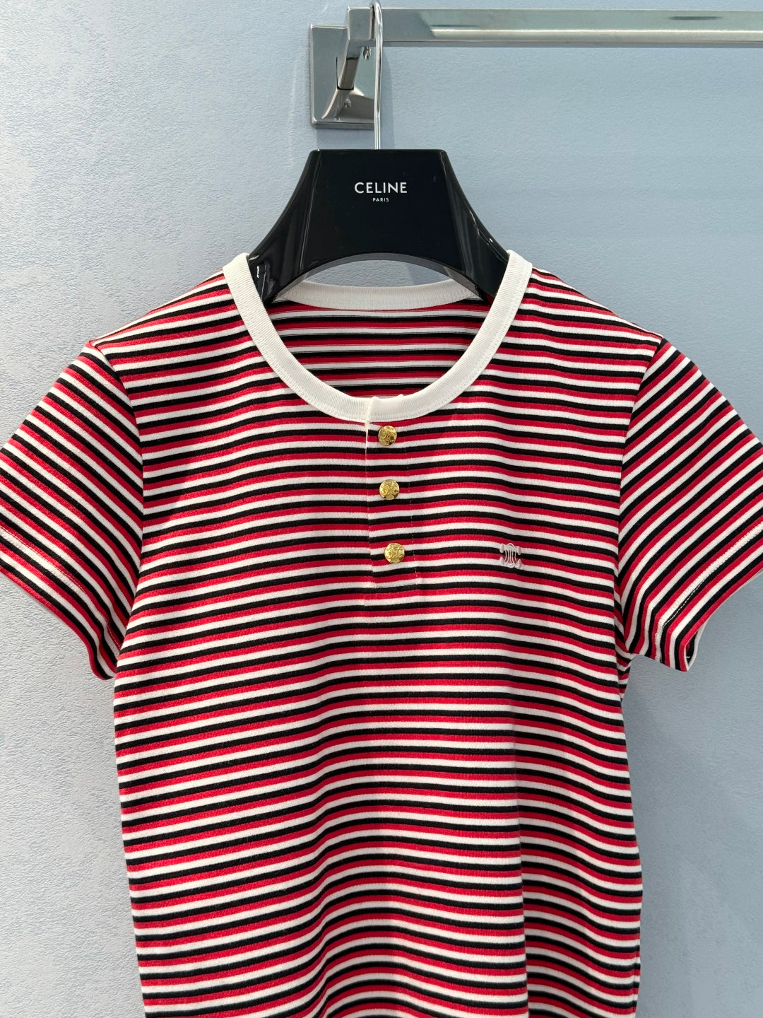 Celine 25 Striped Short-sleeved T-shirt Red White mix Black cotton