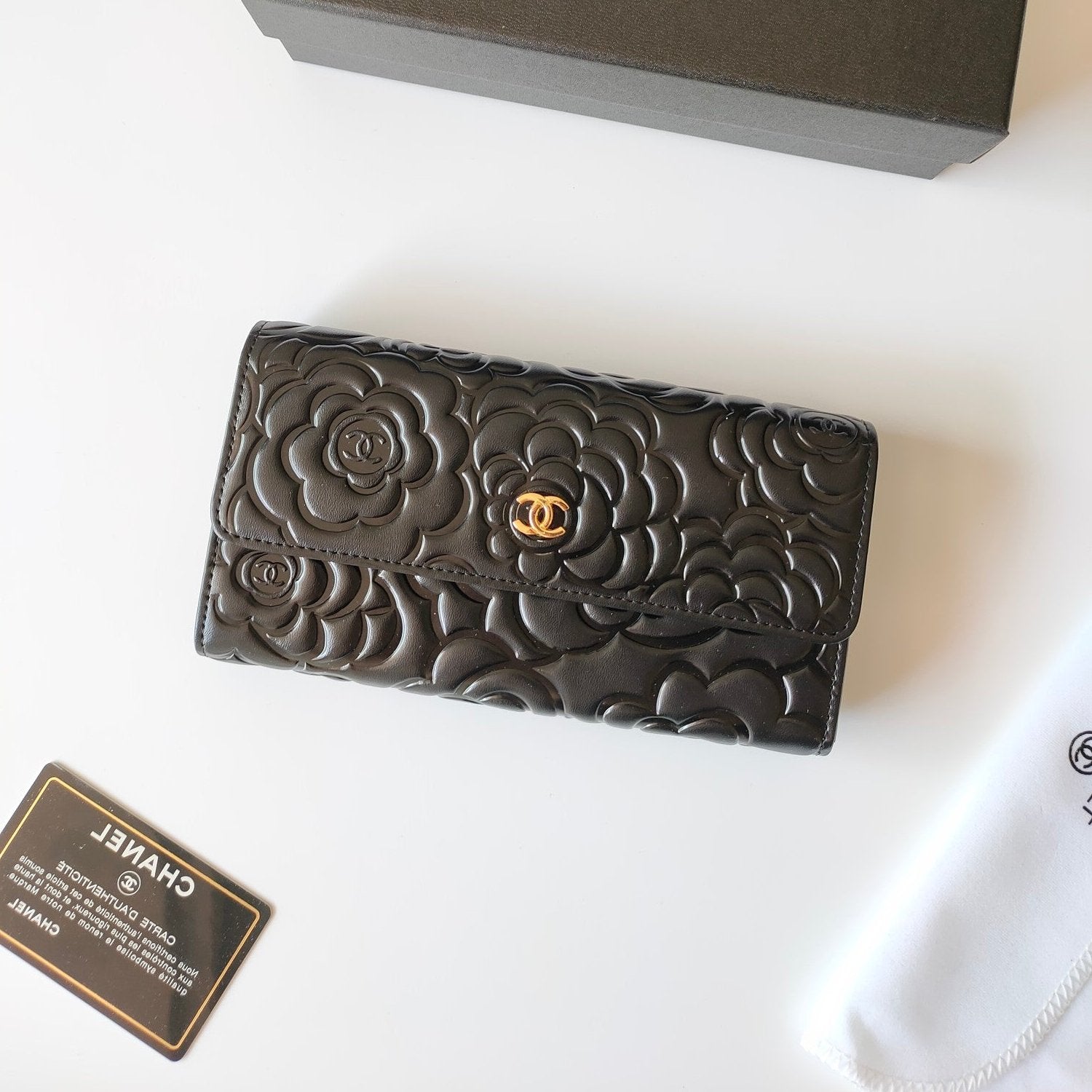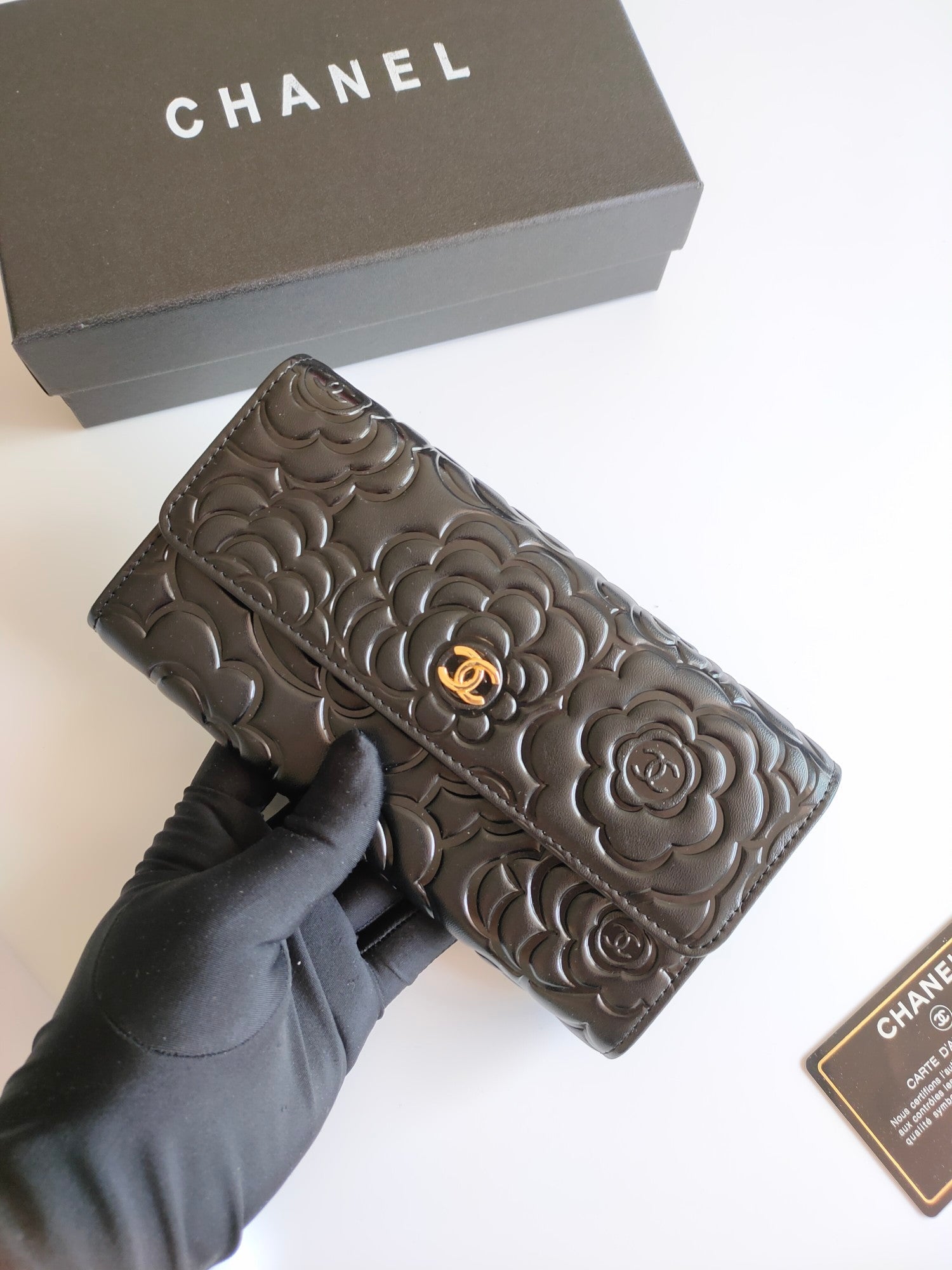CC CLASSIC LONG PURSE CAVIAR 19 BLACK CALFSKIN EMBOSSED CAMELLIA