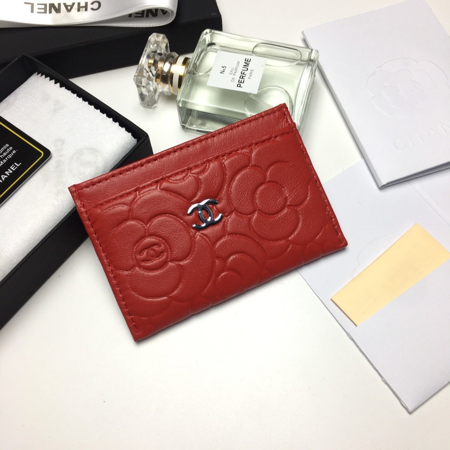 CC FLORAL CARD HOLDER 11.2 RED CALFSKIN SILVER ICON