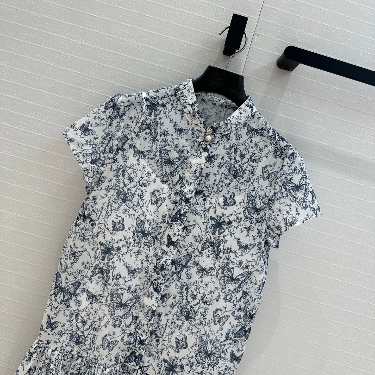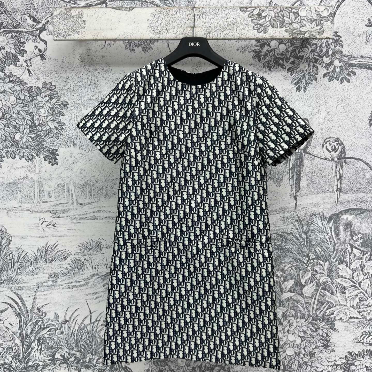 CD 2025 Floral Short-sleeved Belt Shirt Dress Black mix White Cotton