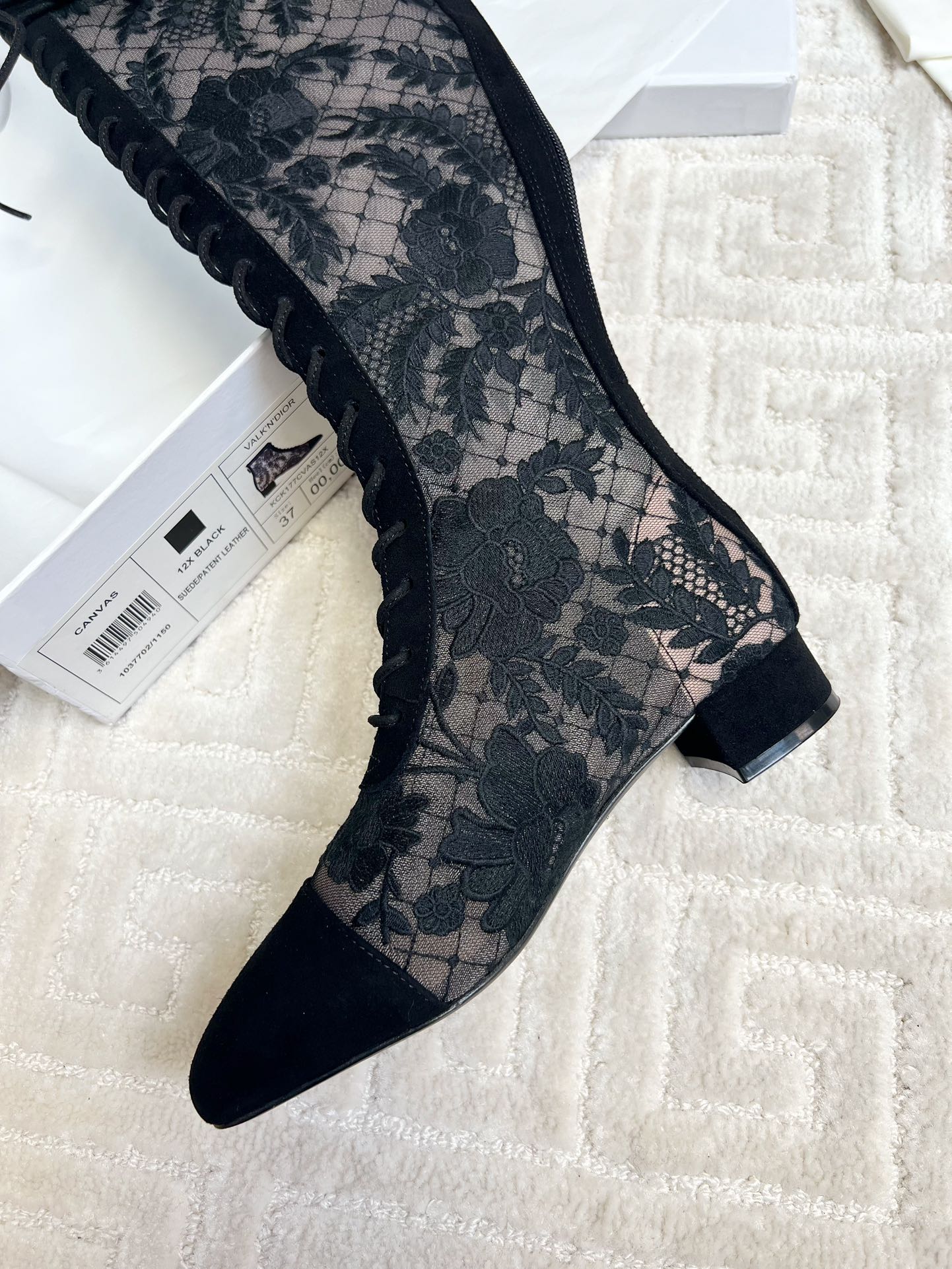CD Naughtily-D Heeled High Boots Black Transparent Mesh Roses Embroidery And Suede