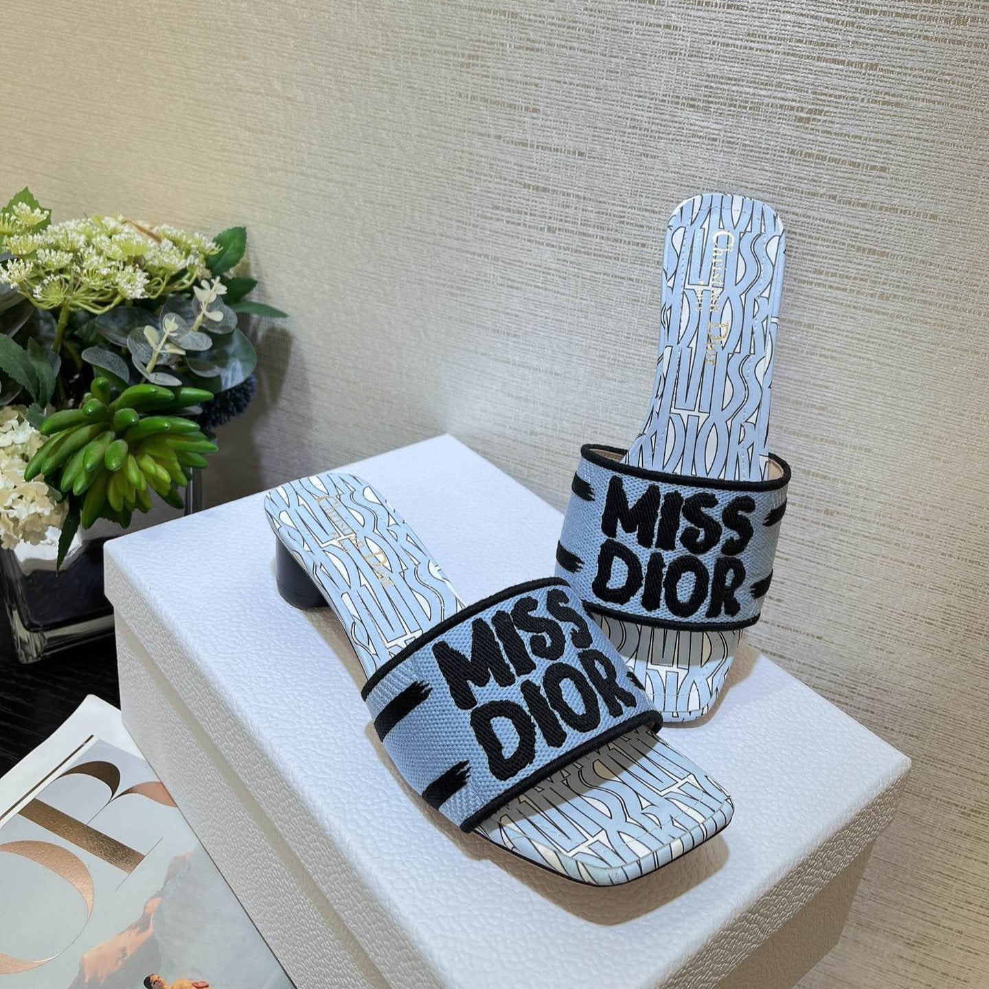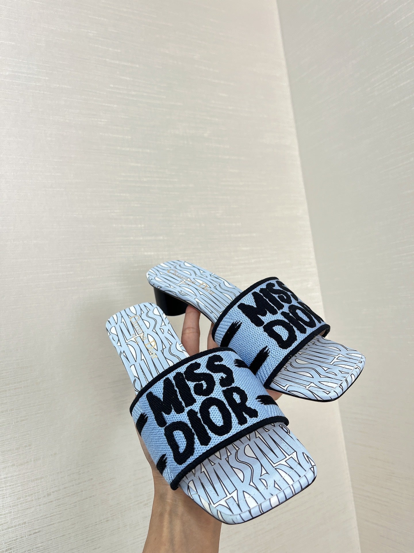 dway heeled slide 35 embroidered cotton cloud blue miss cd alllover motif