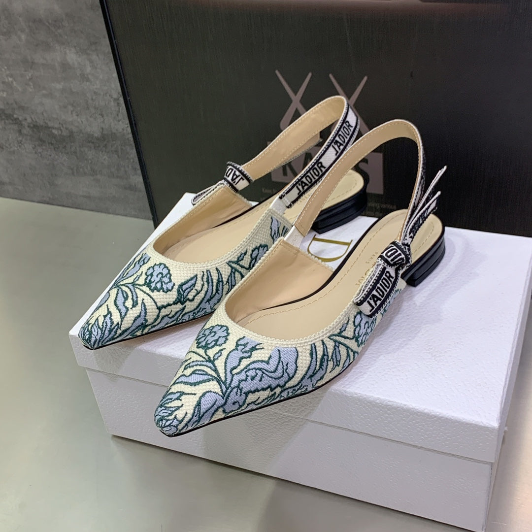JAdior Slingback Flat Duck Blue Embroidered Cotton with Gold-Tone Metallic Thread