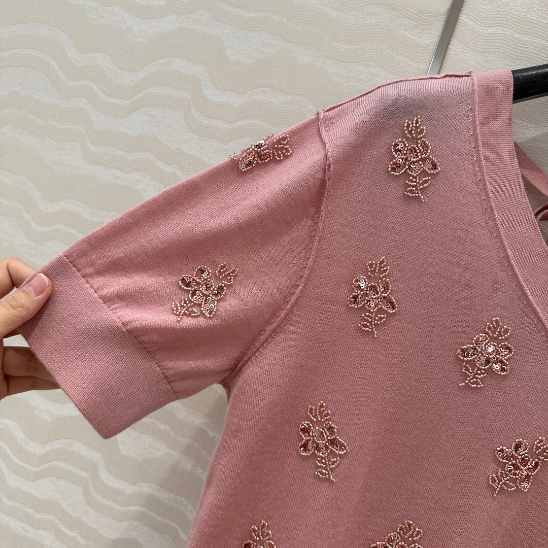 Fendi Beaded Flower V-neck Knitted Small Top Pink Wool