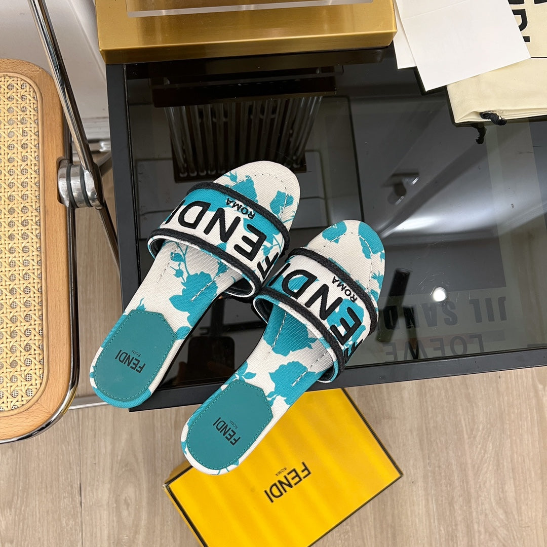 FENDI FLORAL SLIDES IN BLUE MIX WHITE FABRIC