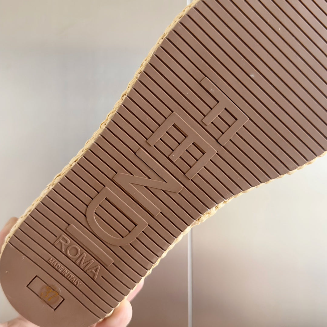 FENDI PLATFORM WEDGES IN BEIGE RAFFIA WITH BROWN EMBROIDERED LOGO