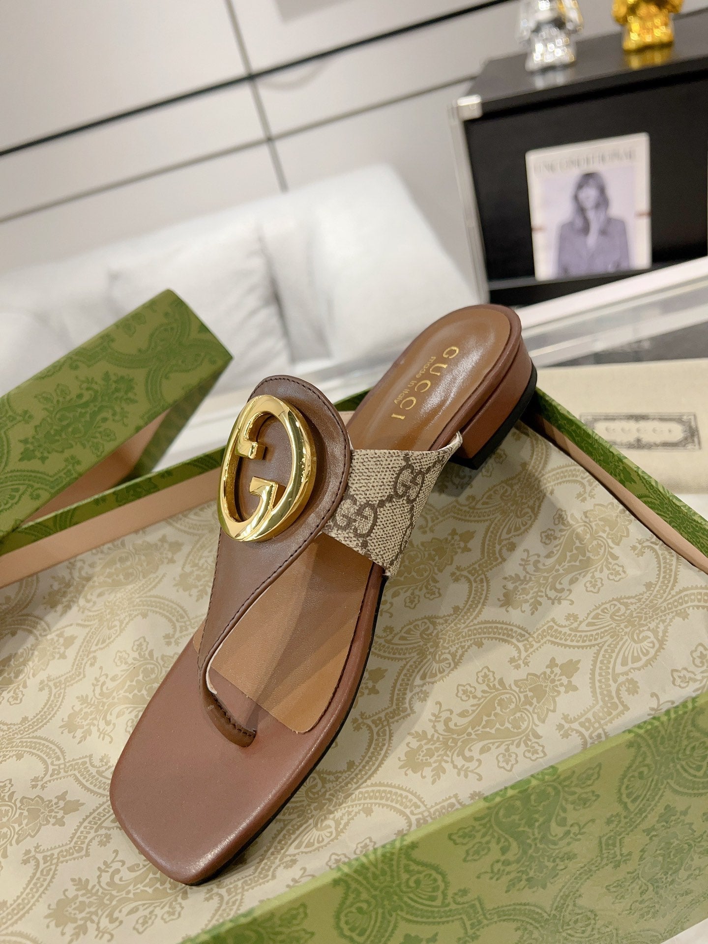GC 2025 Double G Block Heel Thong Sandals brown Leather 292411