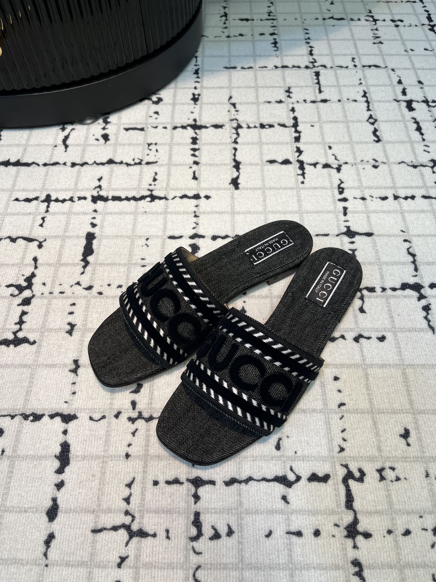 GG SLIDE SANDAL WITH GUCCI SCRIPT BLACK DENIM