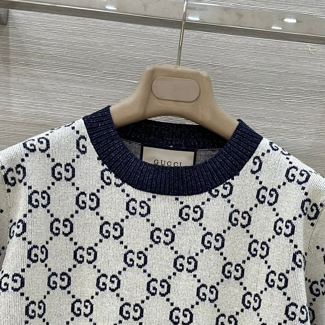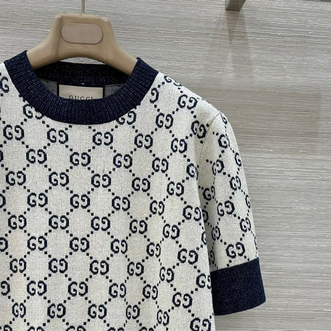 Gucci 2025 Knitted Round Neck Short-sleeved Top Blue Gray Cotton