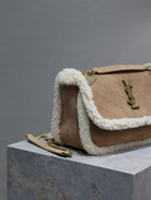 NIKI SMALL 22 IN CAMEL SUEDE AND WHITE SHEARLING