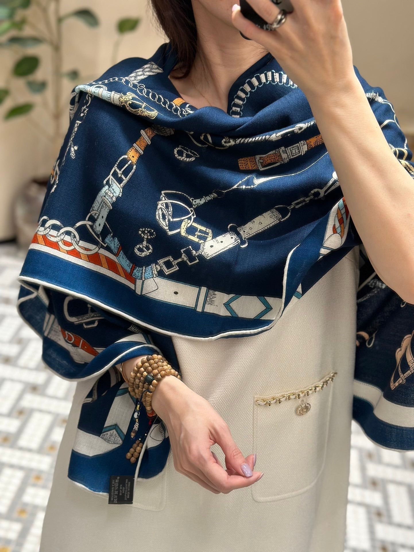 Chevaux Dechaines Shawl 135 CM IN Dark Blue Colorful Cashmere Silk 373682
