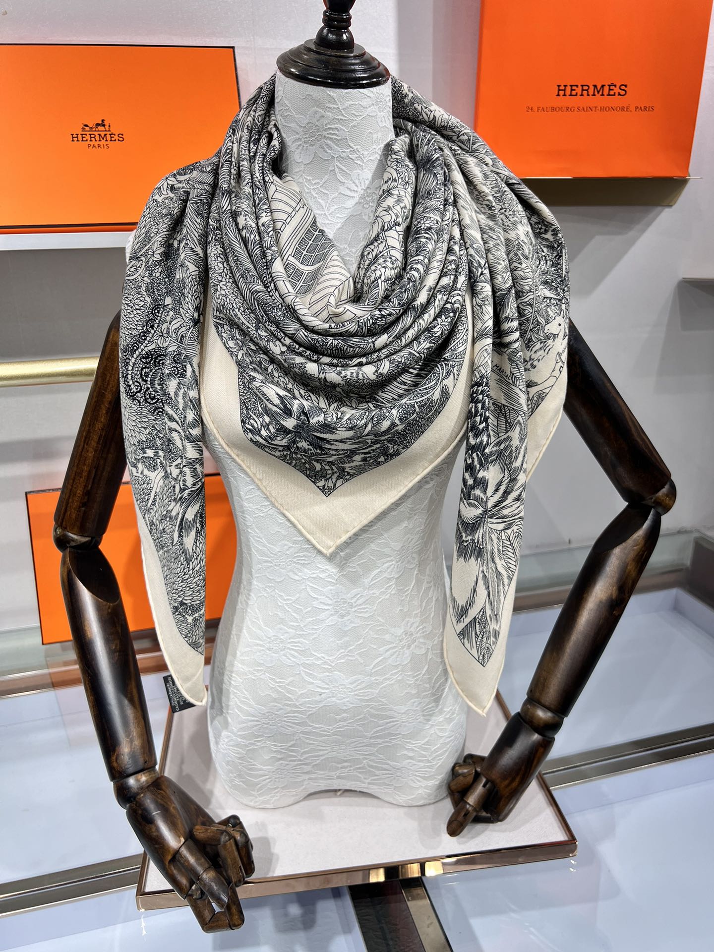 Faubourg Tropical Scarf 135 CM Black White Cashmere And Silk