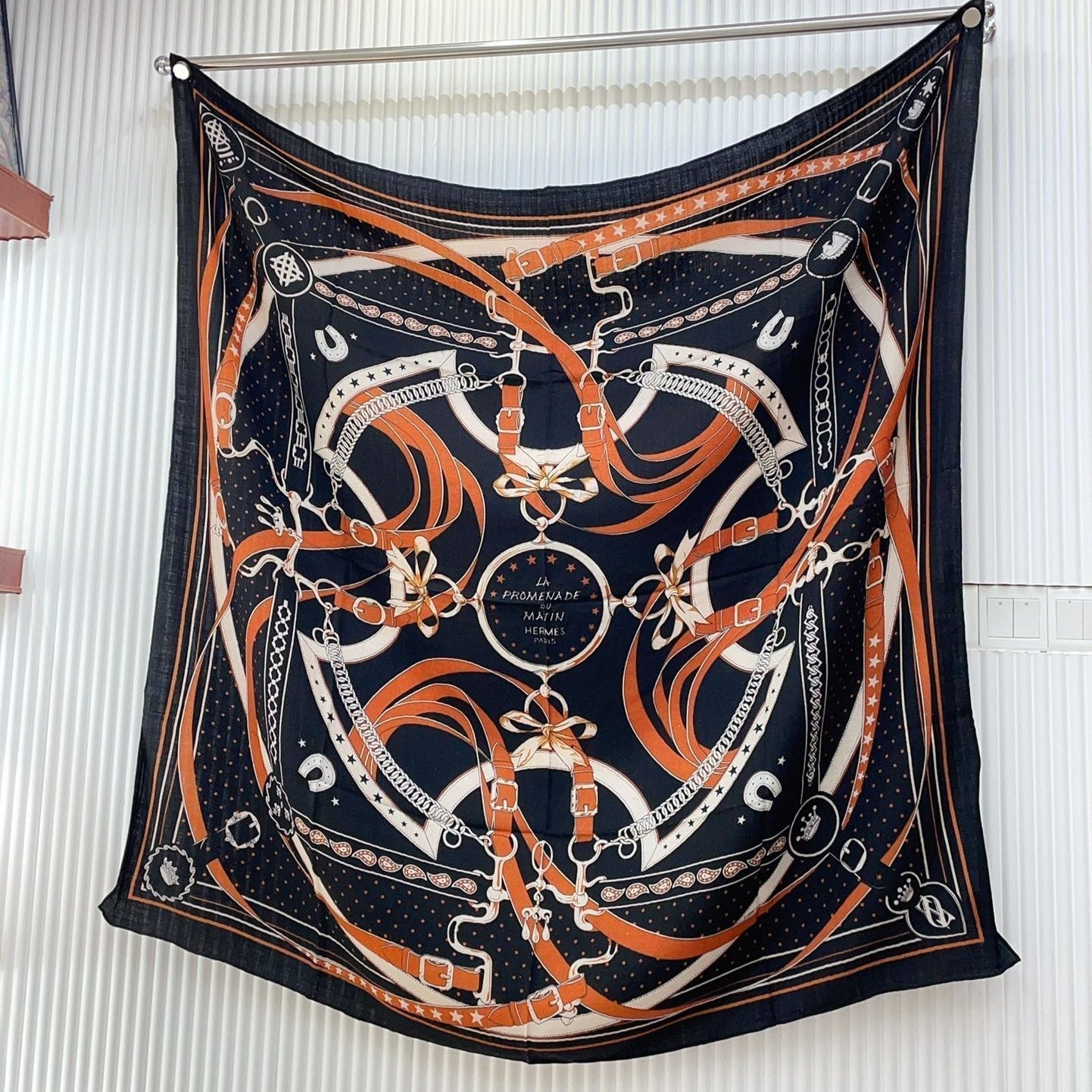 Square Scarf 140CM Black Mix Orange White Cashmere And Silk