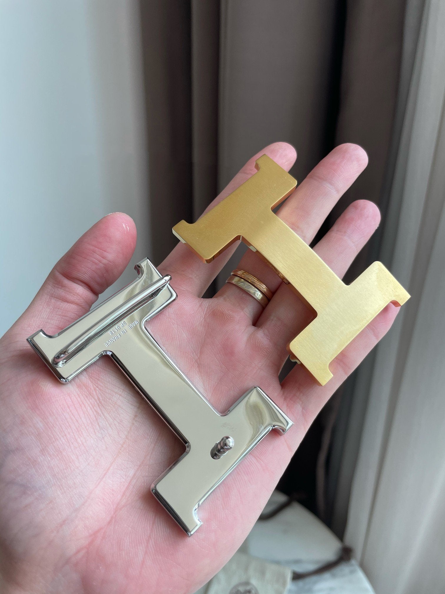• H Buckle in permabrass plated metal.