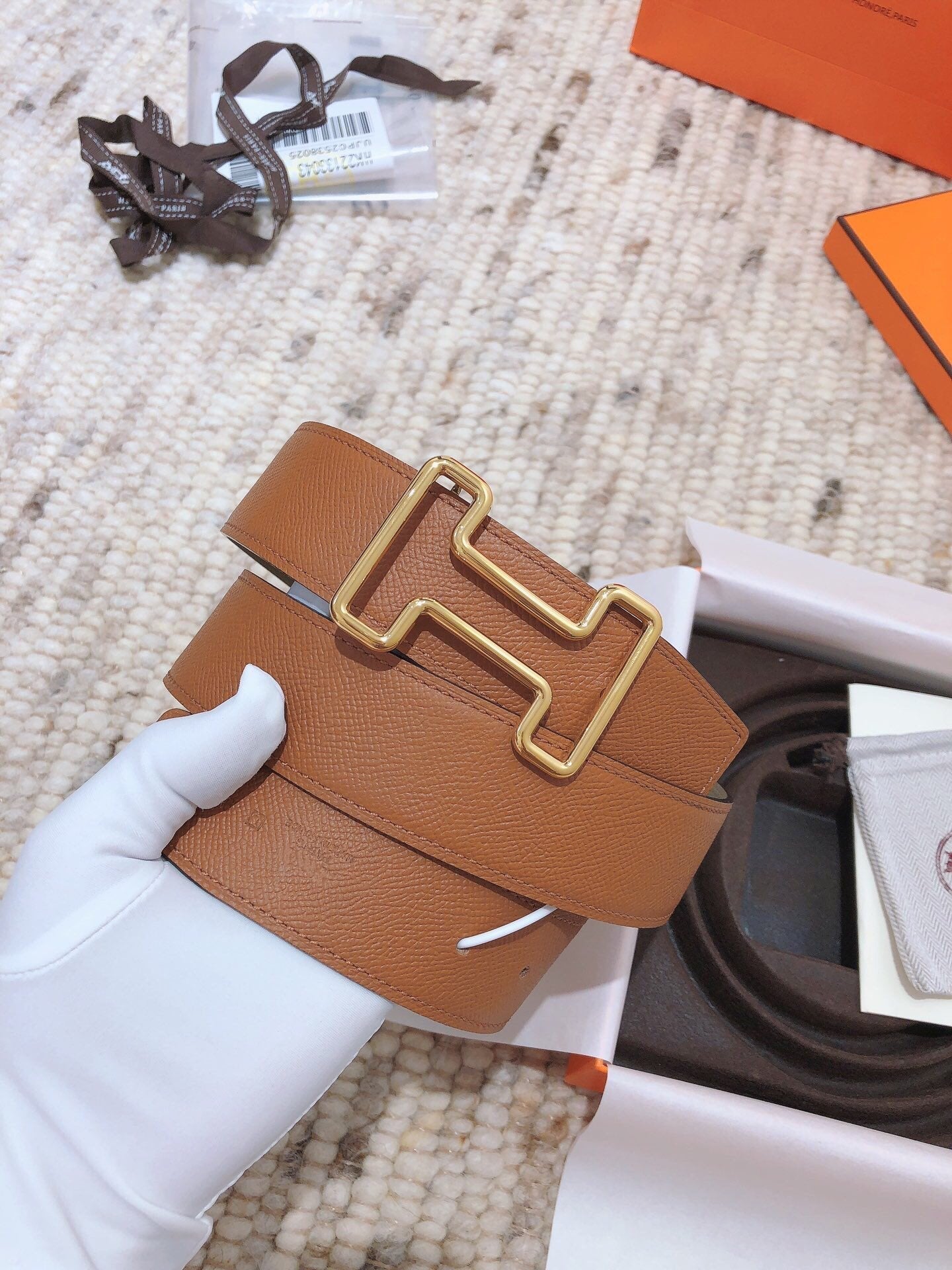 • H Buckle in permabrass plated metal.