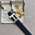 HM BELT BUCKLE & REVERSIBLE BLACK LEATHER STRAP 38MM GOLD HARDWARE