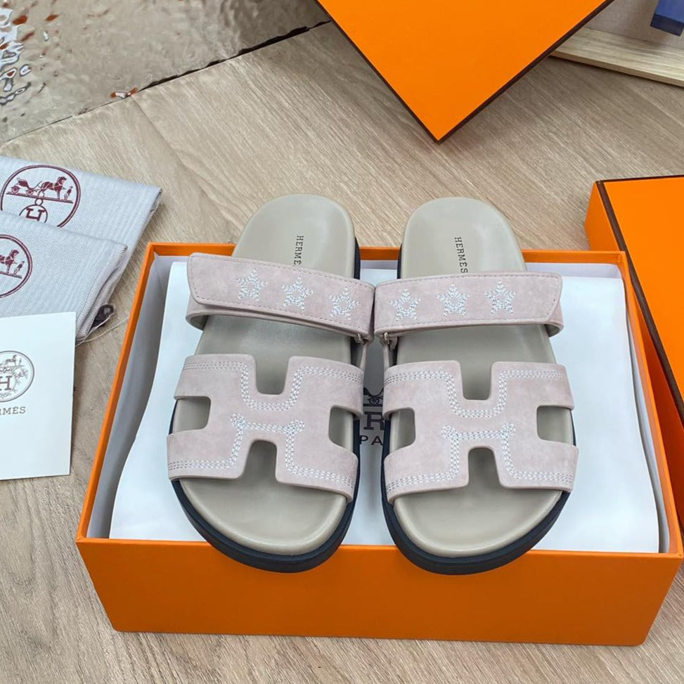 chypre sandal pinkish beige suede calfskin white thread embroidered
