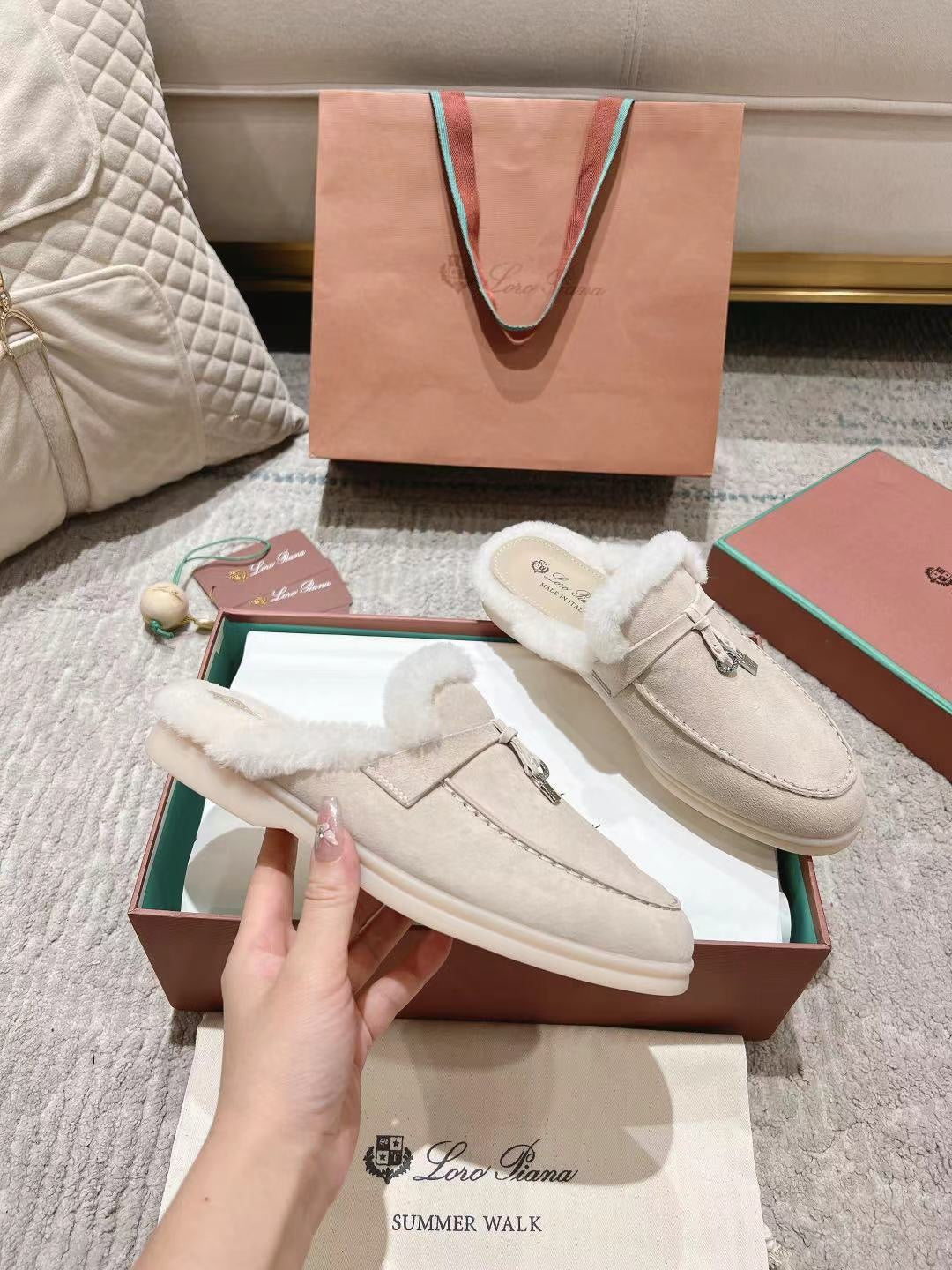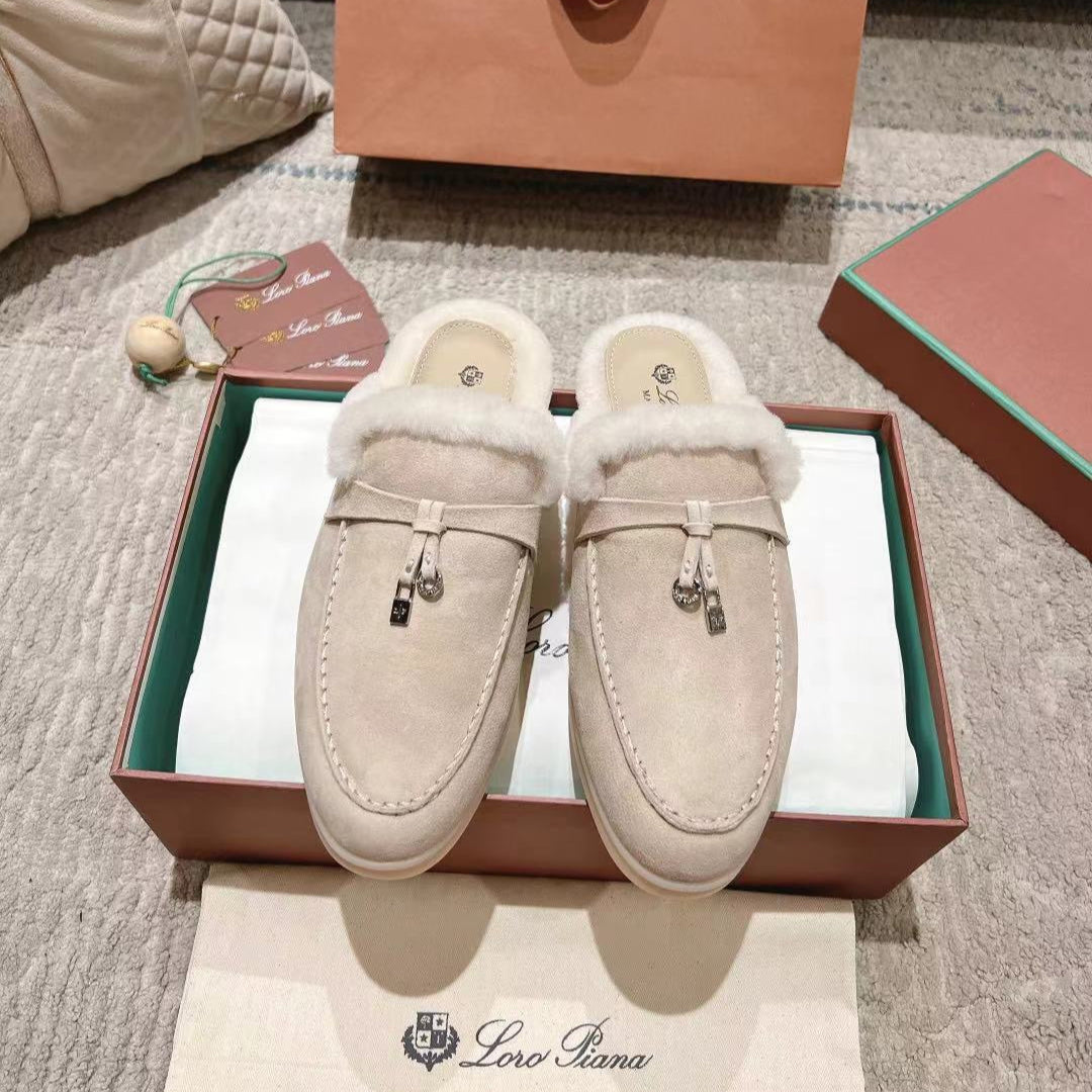 LP Charms Walk Babouche Loafer Bisque Cream mix White Suede With Rabbit Fur Lining 206243