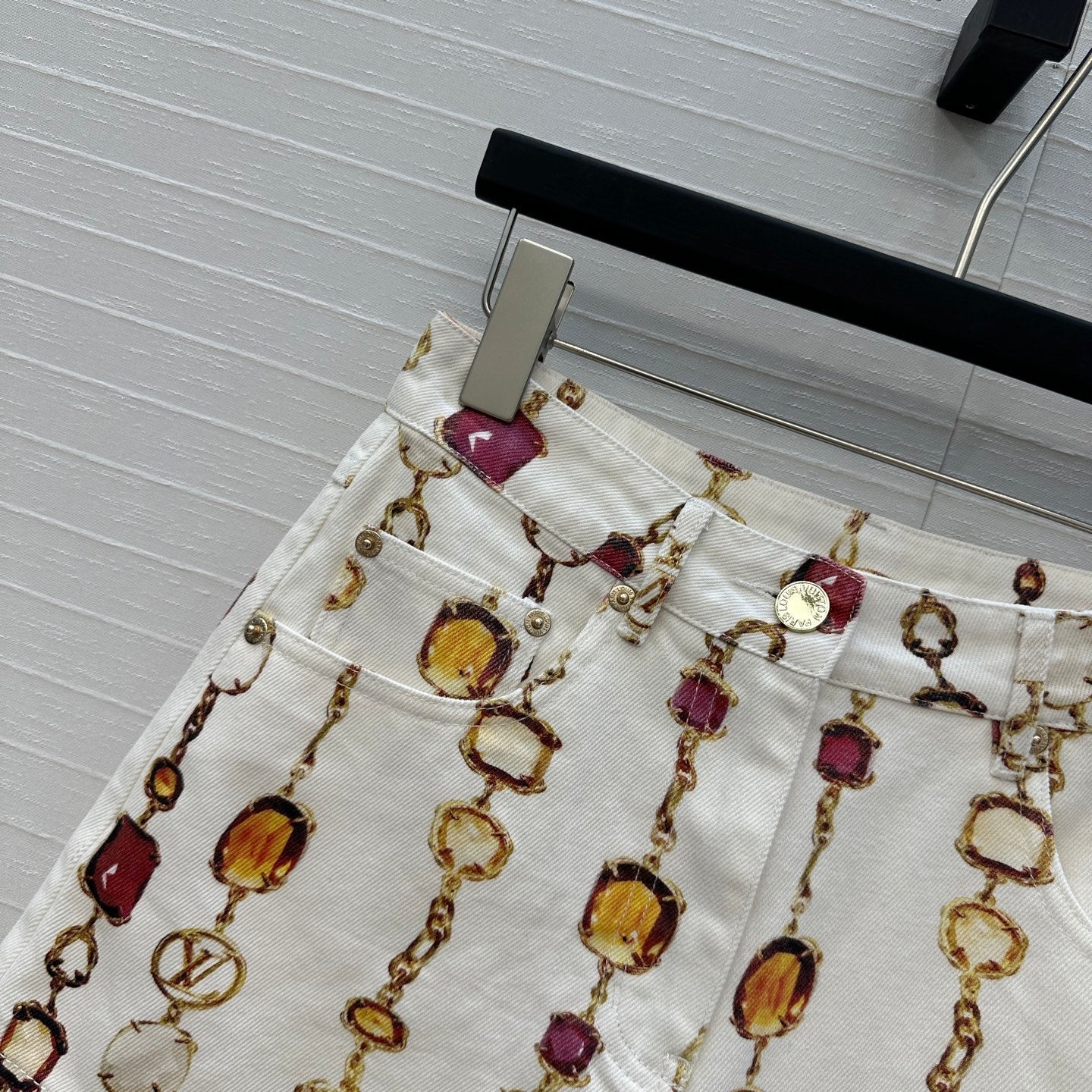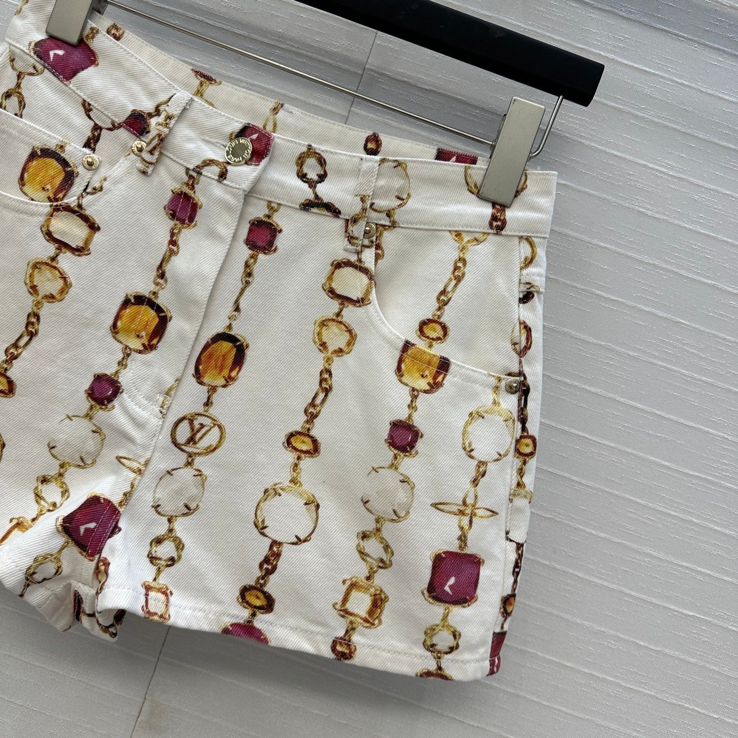 LV 25 Bourgoise Series Printed Zipper Denim Shorts White Cotton
