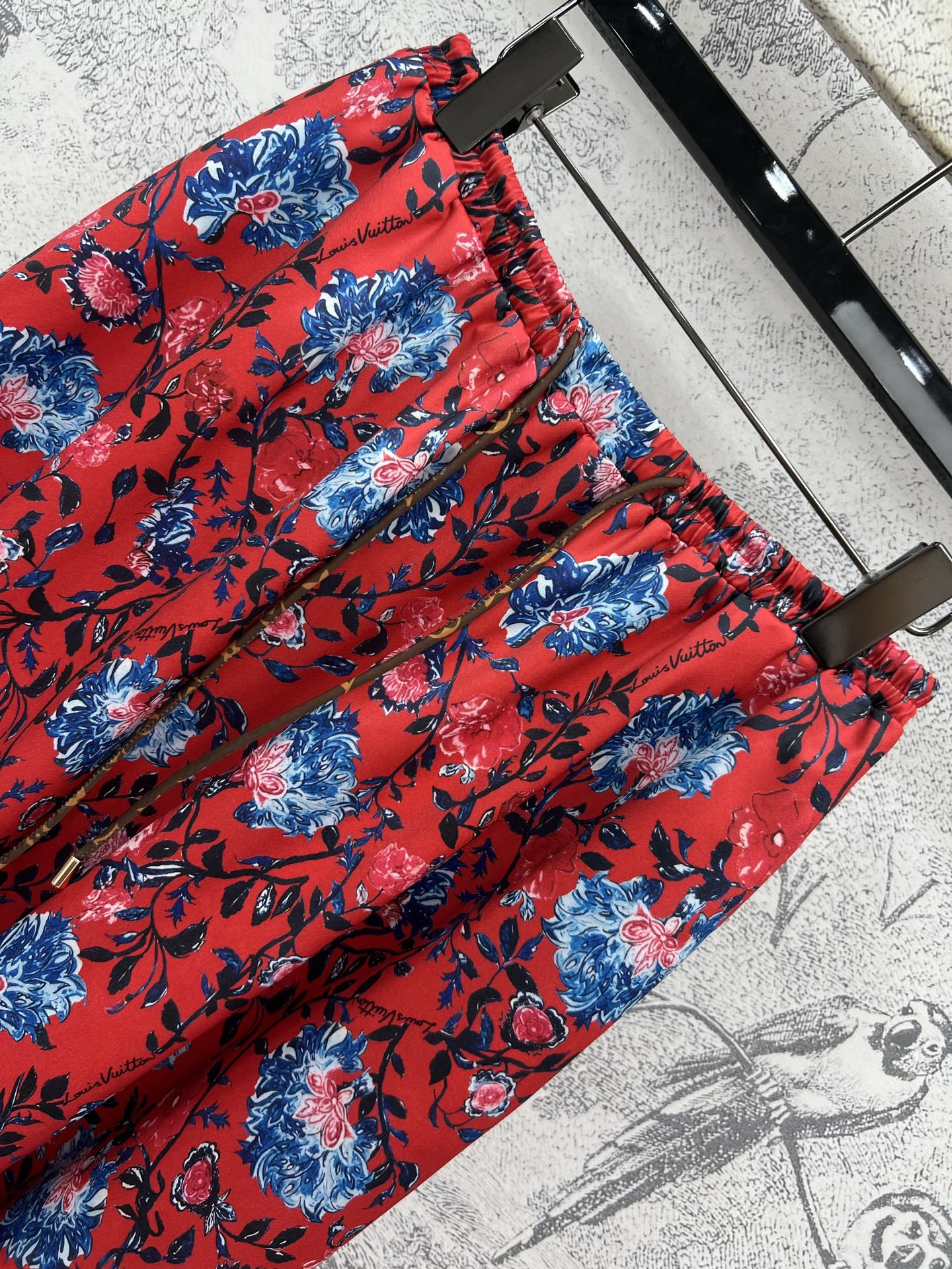 LV 25 Elastic Waist Old Flower Leather Skirt Red Poliester