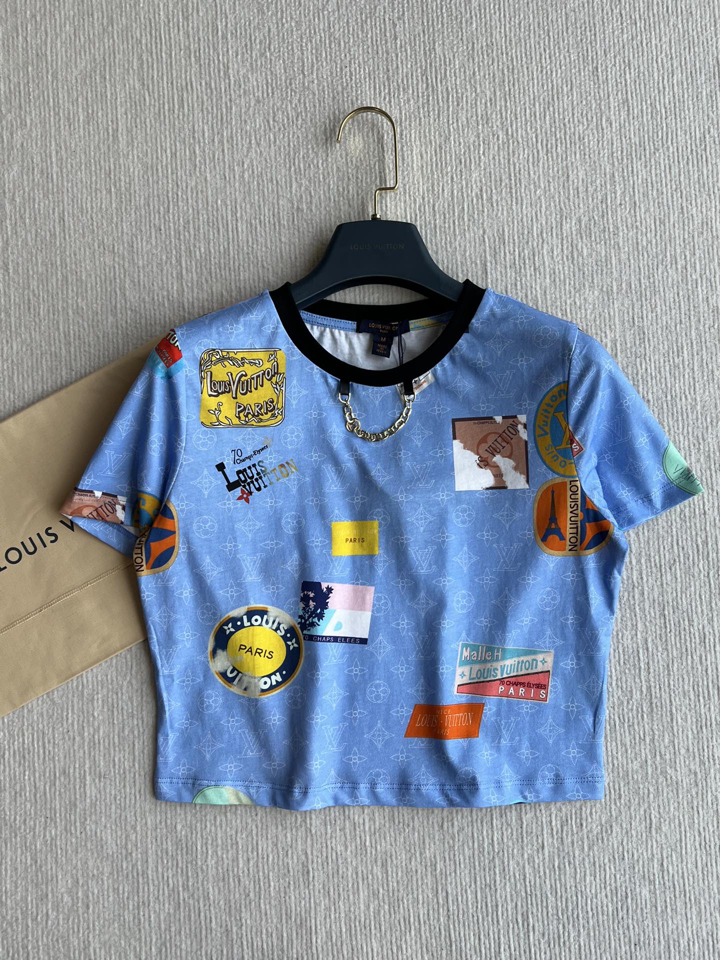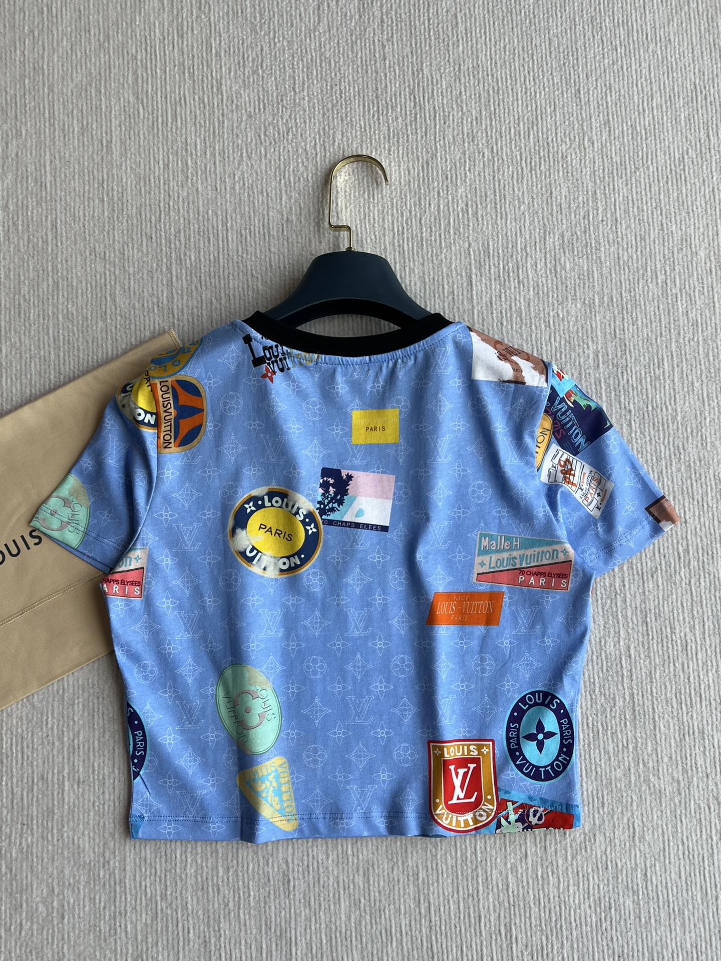LV 25 Print Contrast Color Threaded Edge Collar T-shirt White Blue Cotton