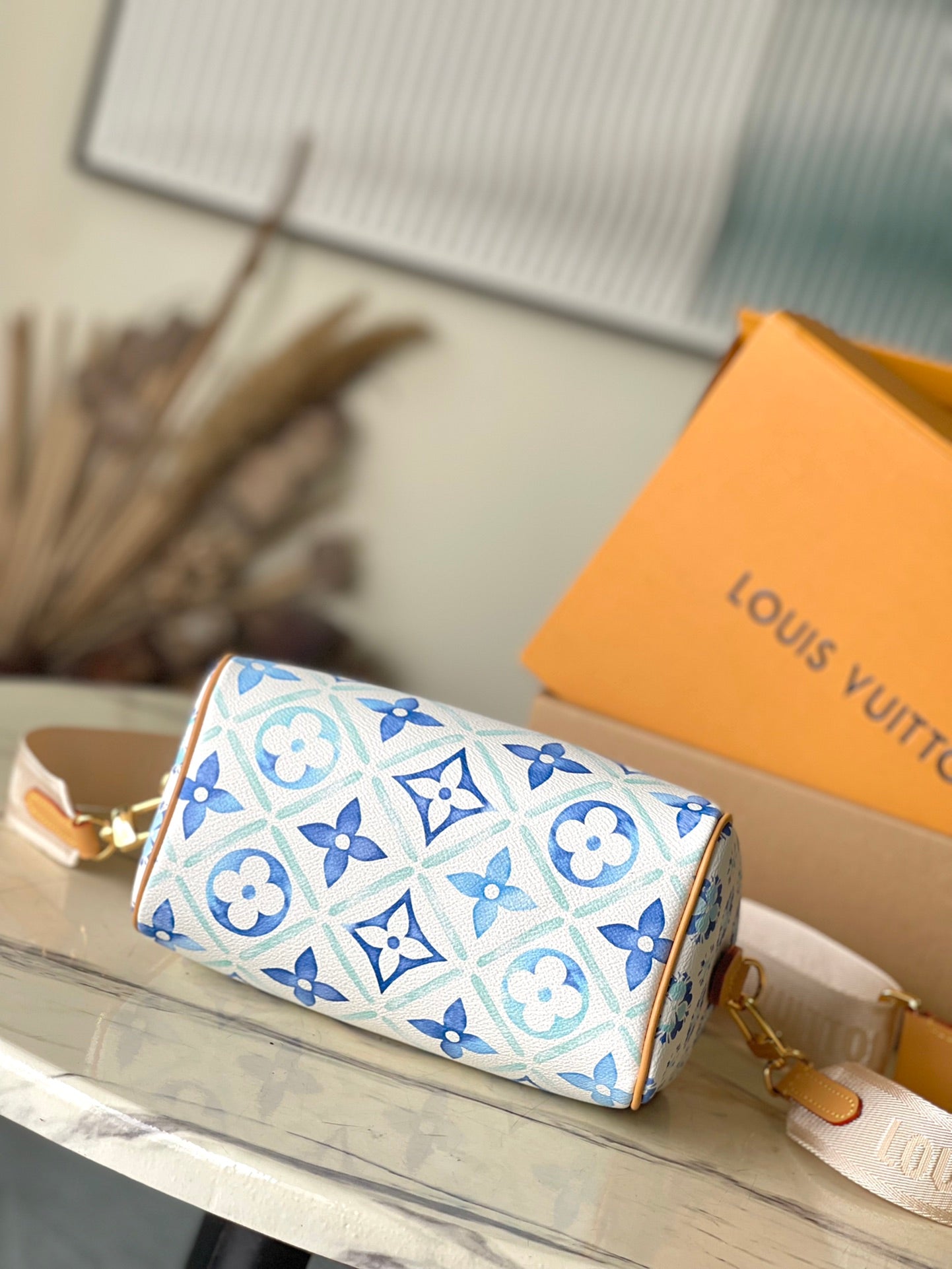 SPEEDY BANDOULIÈRE 20 IN LAGOON BLUE MONOGRAM TILES CANVAS GOLD BUCKLE