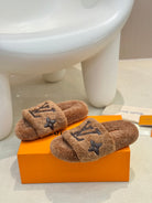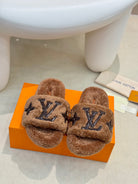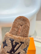 LV Fur Slippers Cocoa Brown With Black Text Pure Wool